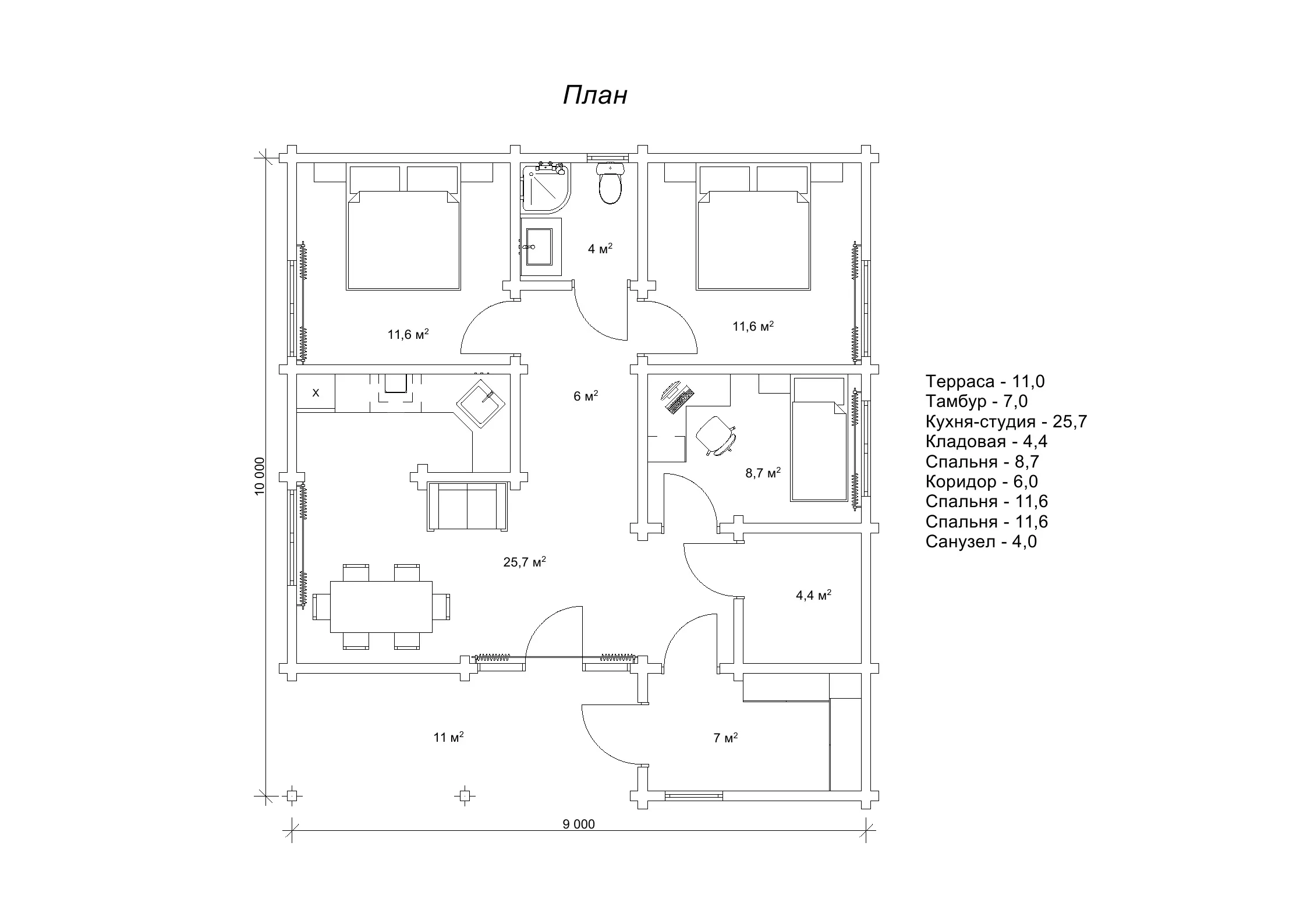 Головна відмінна риса планування котеджу «Асгір» полягає у наявності трьох житлових кімнат. Дві спальні в будиночку спроектовані однакового розміру, і він становить 11,6 м2. Одну житлову кімнату сплановано на дев’яти квадратах. Тут може бути дитяча кімната, кабінет, гостьова спальня або творча майстерня, залежно від вподобань господарів. Окрім житлових кімнат у проекті «Асгір» передбачена кухня-студія на 25,7 м2, комора, коридор та тамбур. У приміщенні, призначеному для комори, можна обладнати котельну. Наш архітектор надає лише рекомендації щодо планування проектів, але кожен з будиночків можна облаштувати за своїм бажанням та зробити у себе в житлі такий набір кімнат, який створить справжній затишок. Будівництво трикімнатного котеджу за проектом «Асгір» займе небагато місця, його габарити складають 10 на 9 м2. Але навіть на такій компактній площі фахівці «Домінант» вміють розмістити все необхідне для створення найкращих життєвих умов.