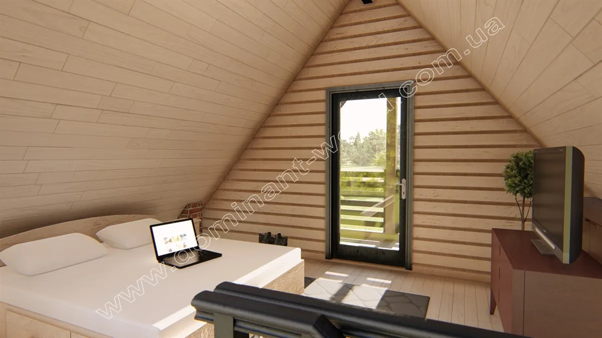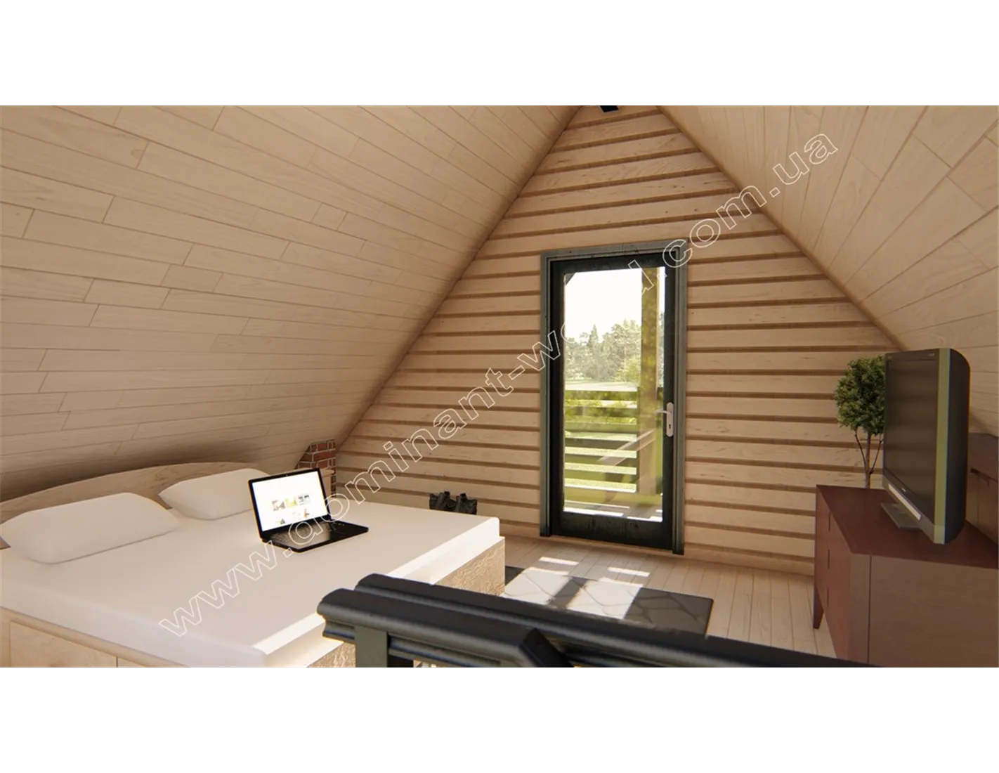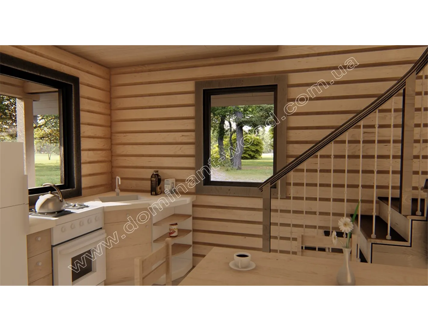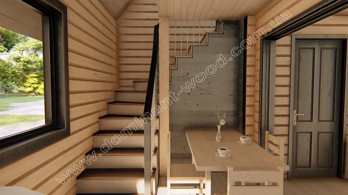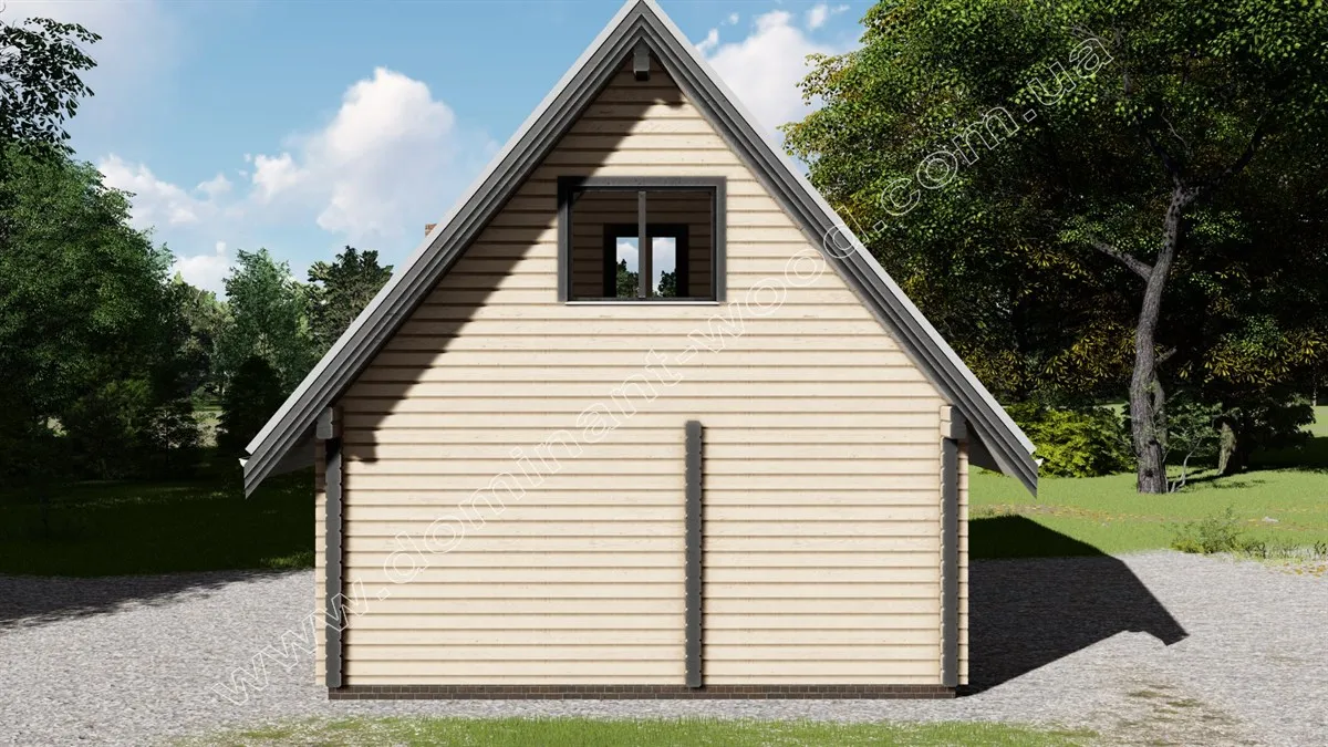 Гостьовий котедж «Веліна» приваблює стильними фасадами з відшліфованого, соснового бруса. Вхідна група оформлена гармонійним тандемом навісу та балкону. Усередині котеджу є зал, кухня, санвузол та сходи. Всі приміщення та сходова зона максимально ергономічно та раціонально сплановані на першому поверсі. А на другому поверсі-мансарді є простора спальня 23,5 м2 та балкон розміром 9 м2 за аналогією з терасою на першому поверсі. Загальна площа двох поверхів становить 72 м2, і в таких компактних розмірах є абсолютно все, щоб зробити дозвілля в будиночку максимально комфортним. Економічна вартість, стильний екстер’єр дерев’яного будинку, висока якість матеріалу, що використовується в будівництві плюс довговічність і швидкість монтажу - гарні аргументи, щоб прямо зараз оформити замовлення на будівництво котеджу «Веліна».