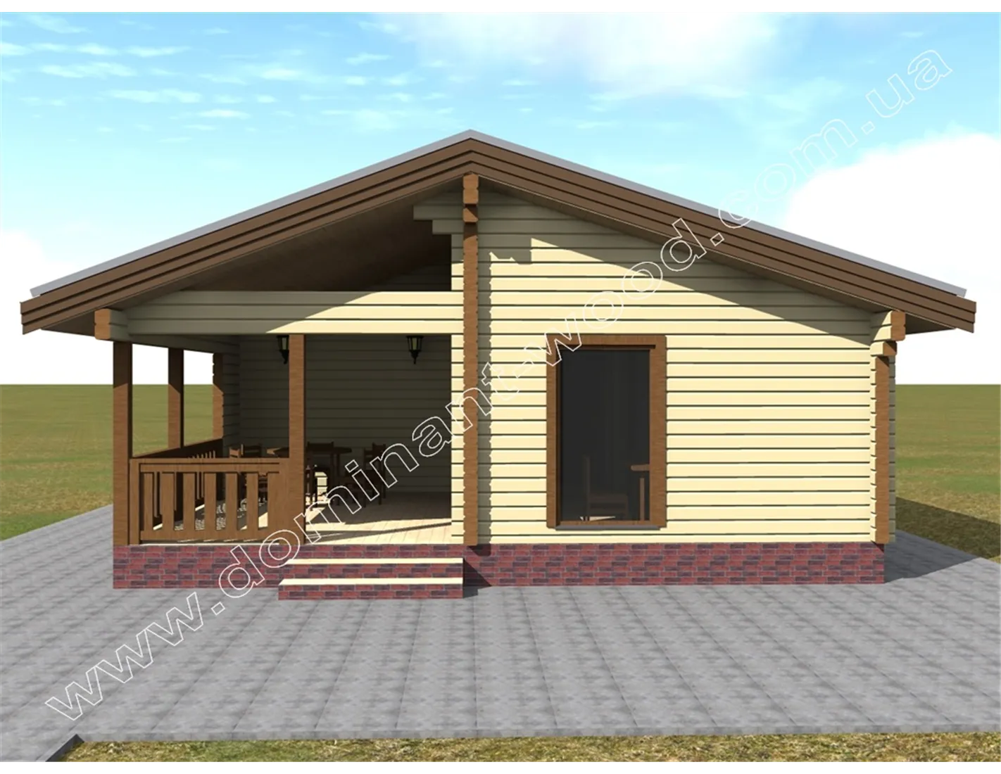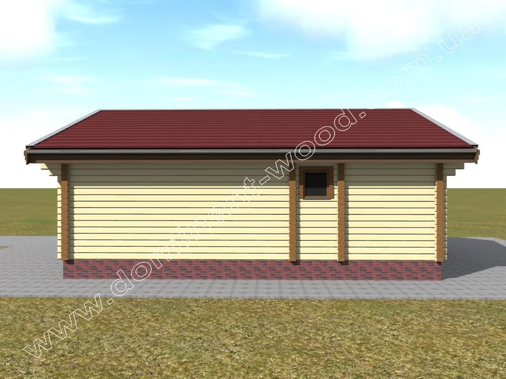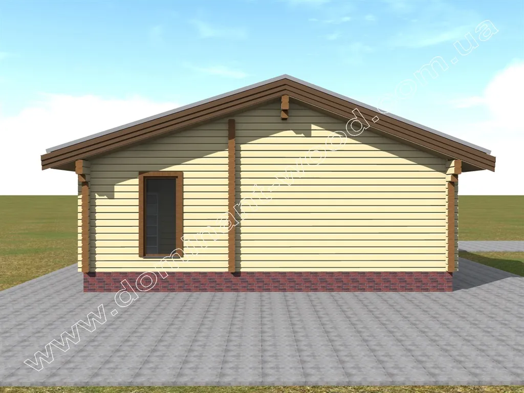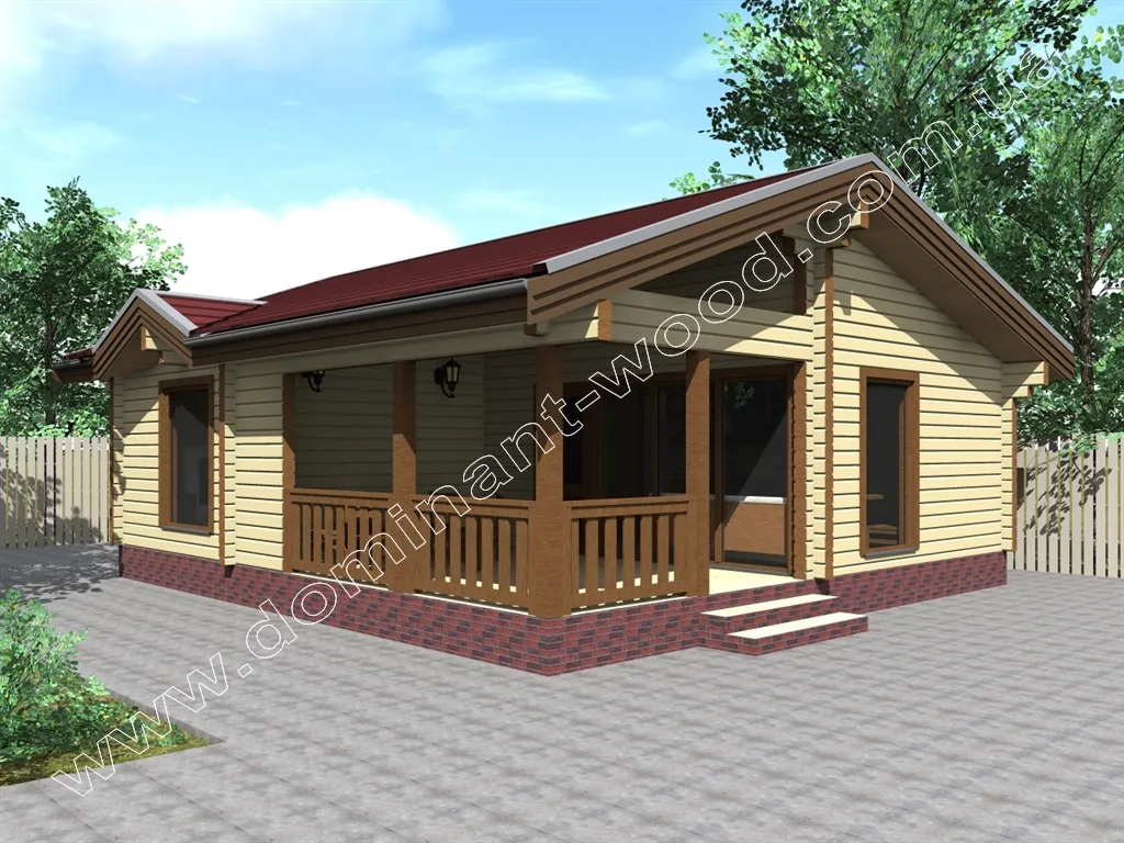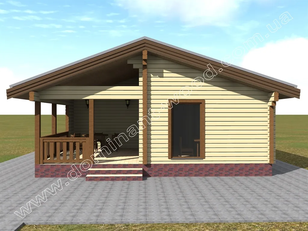 Чарівна будова з розкішною терасою під навісом покрівлі - ось, що можна сказати при першому погляді на проект «Полла». Двосхила покрівля, невелика кількість віконець, компактна форма, достатня товщина стін і естетичний зовнішній дизайн дозволяє визначити проект, як гарний вибір в якості зимової дачі або заміського житла. Завдяки низькому коефіцієнту теплопровідності сосни, стіни котеджу достатньої товщини забезпечать тепло в будиночку взимку і прохолоду влітку. Це означає, що одноповерховий будиночок, побудований за проектом «Полла», можна використовувати всесезонно і не піклуватися про додаткове утеплення в холодну пору року.
