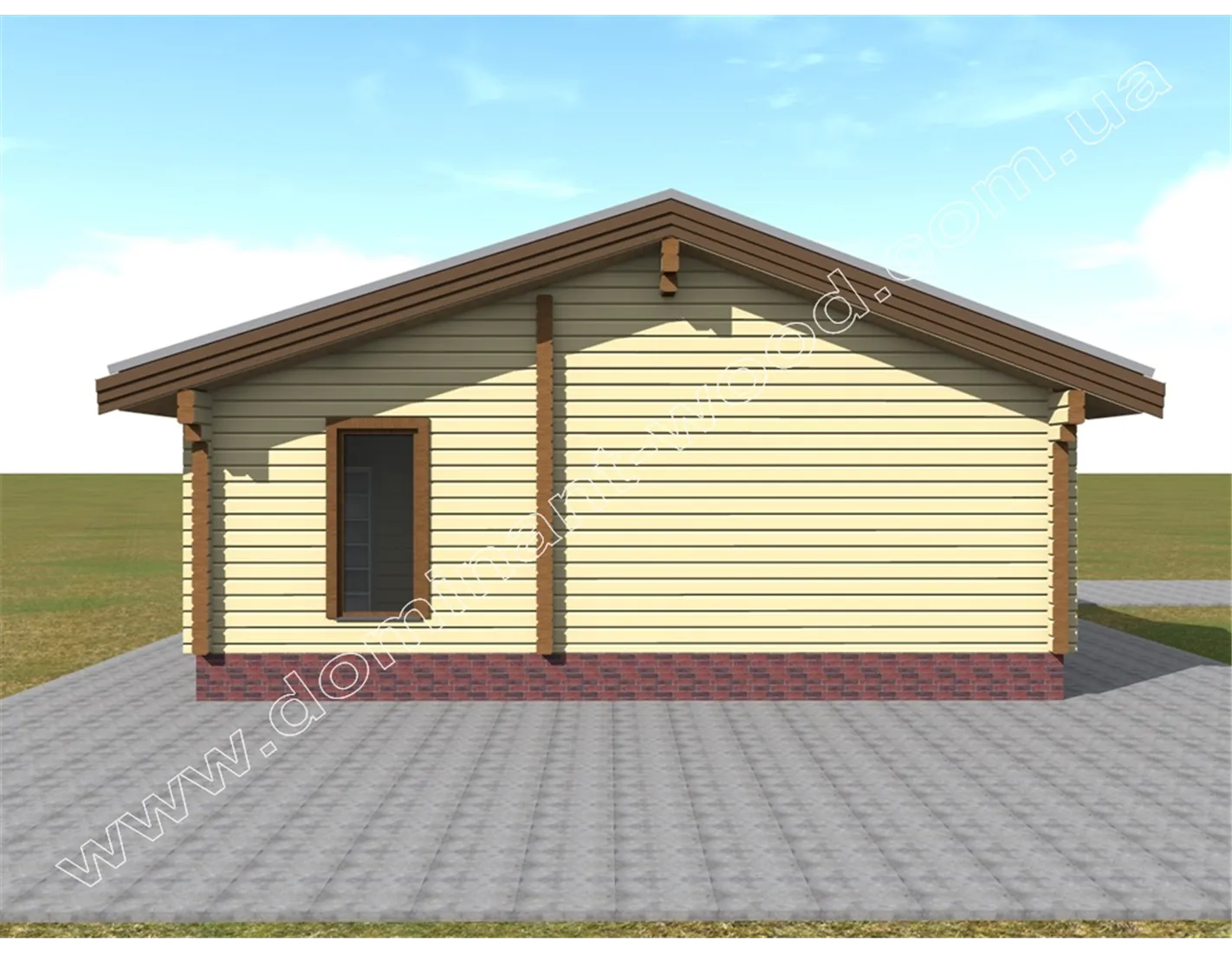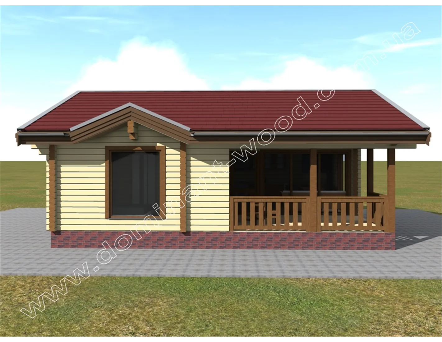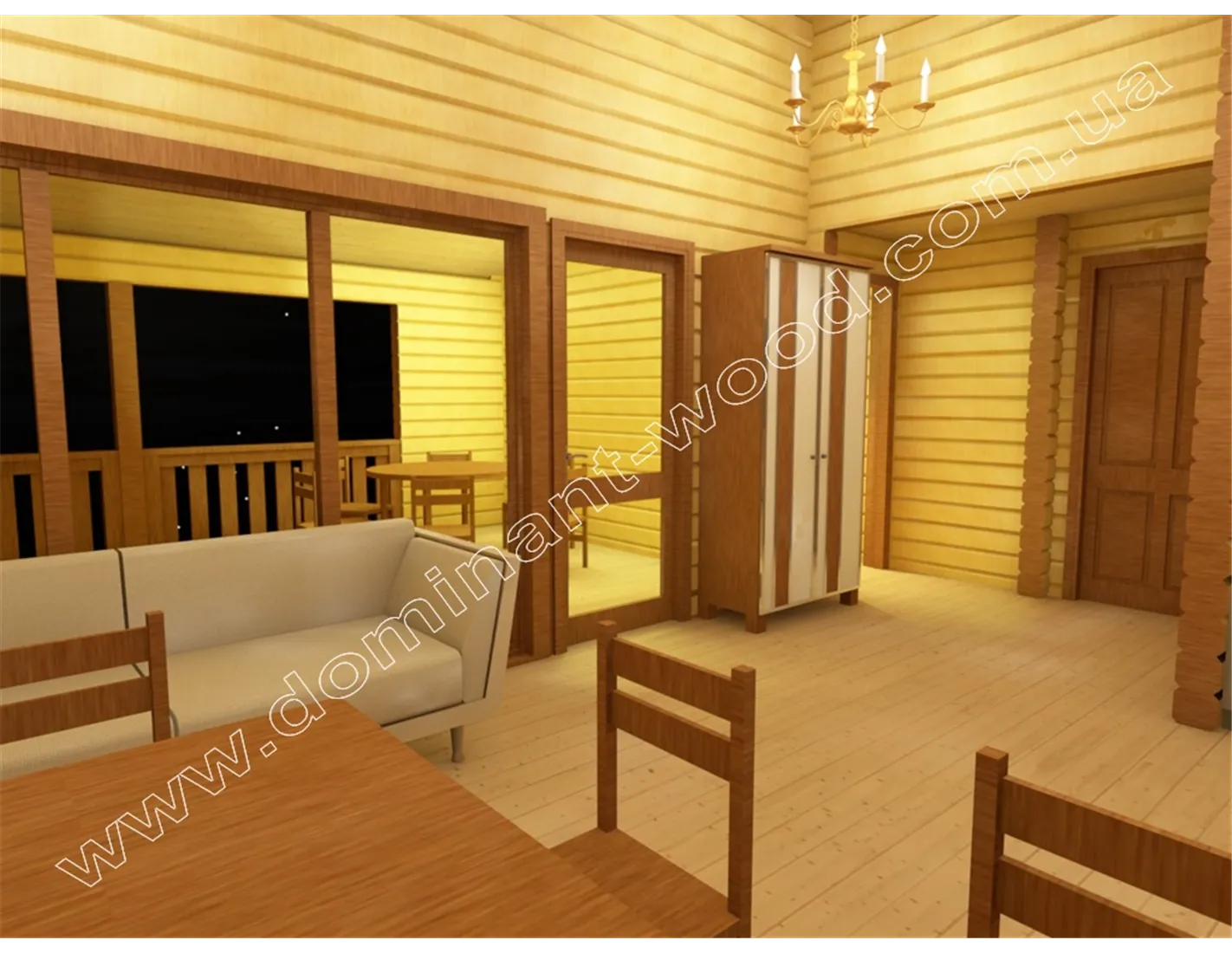 Чарівна будова з розкішною терасою під навісом покрівлі - ось, що можна сказати при першому погляді на проект «Полла». Двосхила покрівля, невелика кількість віконець, компактна форма, достатня товщина стін і естетичний зовнішній дизайн дозволяє визначити проект, як гарний вибір в якості зимової дачі або заміського житла. Завдяки низькому коефіцієнту теплопровідності сосни, стіни котеджу достатньої товщини забезпечать тепло в будиночку взимку і прохолоду влітку. Це означає, що одноповерховий будиночок, побудований за проектом «Полла», можна використовувати всесезонно і не піклуватися про додаткове утеплення в холодну пору року.