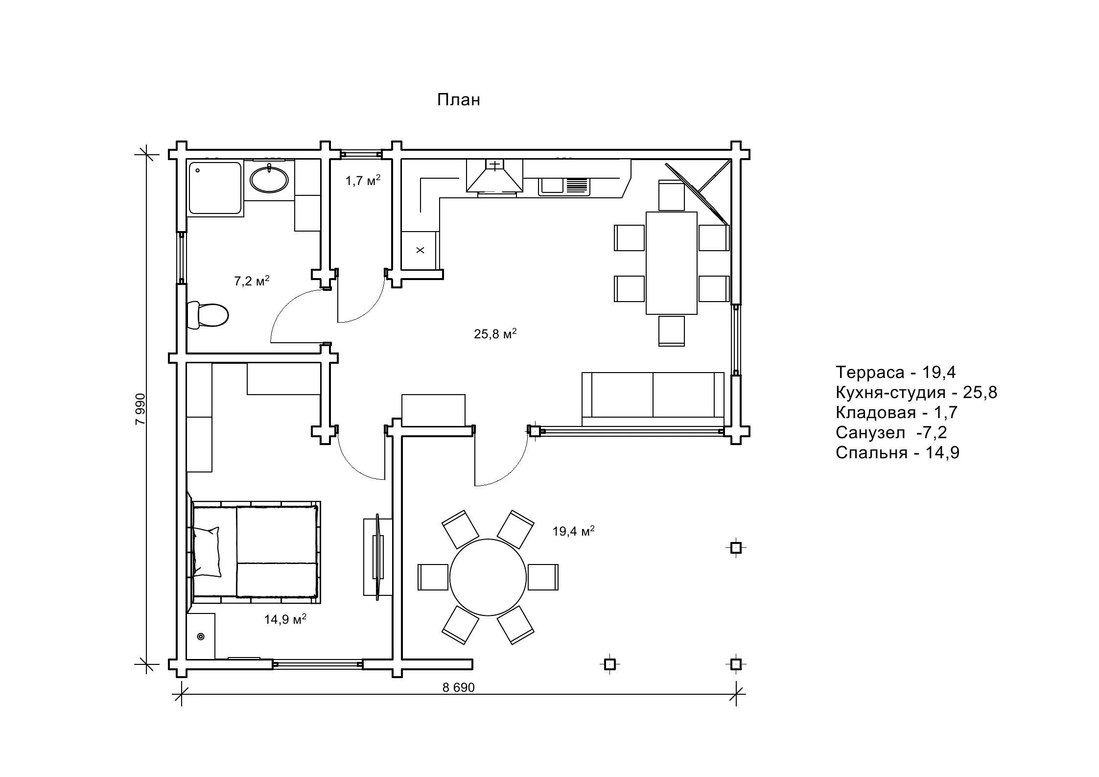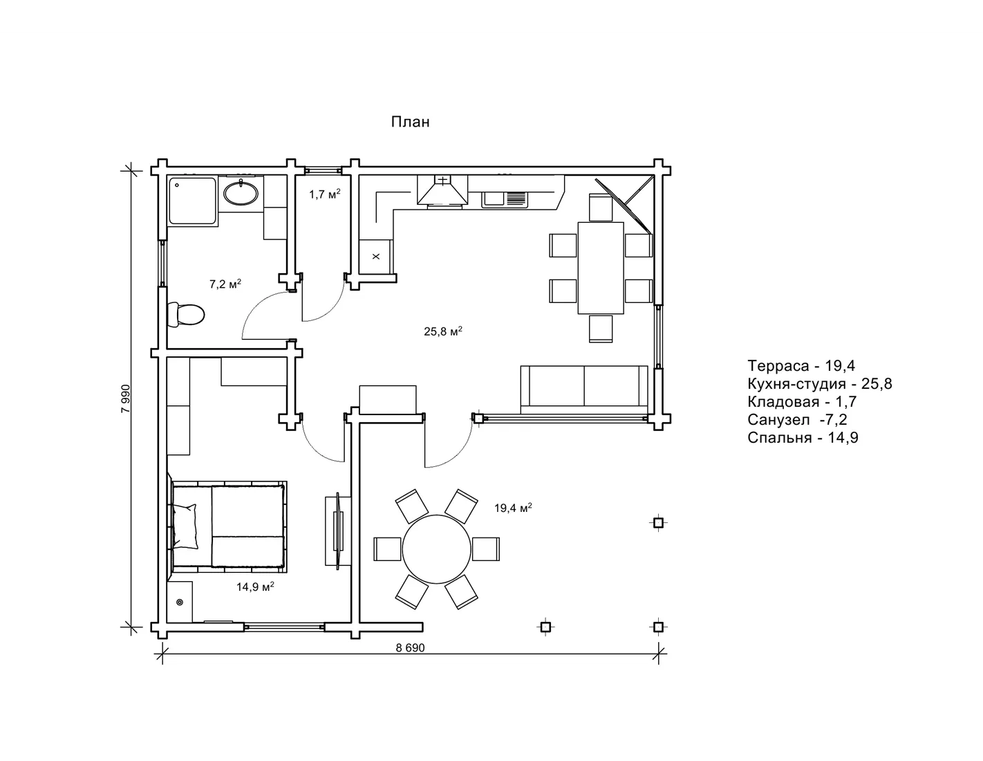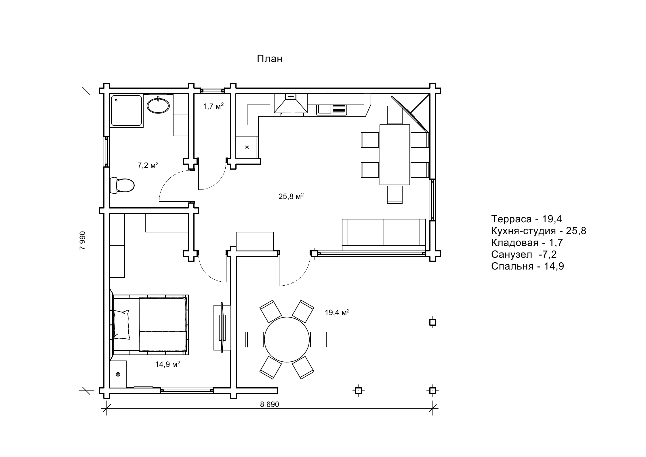 Загальна площа забудови по проекту «Полла» становить 69,4 м2, параметри будови 7,9 на 8,6 м. При в ході в дерев’яний котедж спланована тераса площею 19,4 м2, яку так чудово використовувати в якості альтанки для застіль на свіжому повітрі. Усередині котеджу передбачена велика вітальня на 25,8 м2, що утворює студійний простір з кухнею. Це велика і світла кімната, в якій можна організувати м’який куточок з диваном і поставити великий обідній стіл. Рекомендації по вибору меблів пропонуються на нашому сайті у відповідній статті. Ще в проекті «Полла» спланована затишна спальня, маленька комора та санвузол. Ми створили всі умови в даному проекті для всесезонного комфорту домочадців.