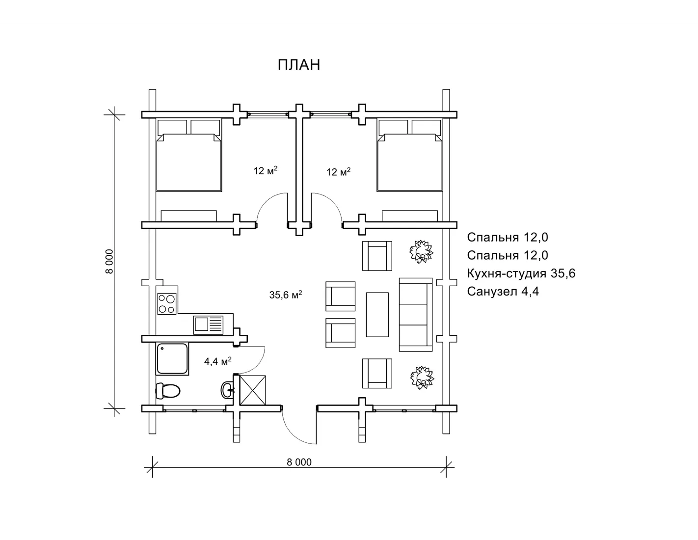 Параметри забудови 8х8 м котеджу «Лекід3» зручні і являють собою стандартний розмір, дуже зручний для більшості замовників. План котеджу передбачає наявність двох зручних спалень по 12 м2. Також ми спроектували велику вітальню площею 35,6 м2, де передбачена функціональна зона кухні і м’який куточок для відпочинку, де також міститься обідній стіл. У котеджі також передбачений санвузол площею 4,4 м2. Як бачимо, оригінальний дизайн проекту «Лекід3» доповнюється внутрішнім комфортом. Планування дерев’яної дачі вміщує все необхідне для відпочинку і проживання в дерев’яному будинку.