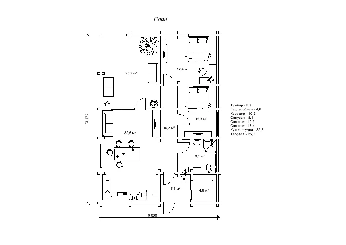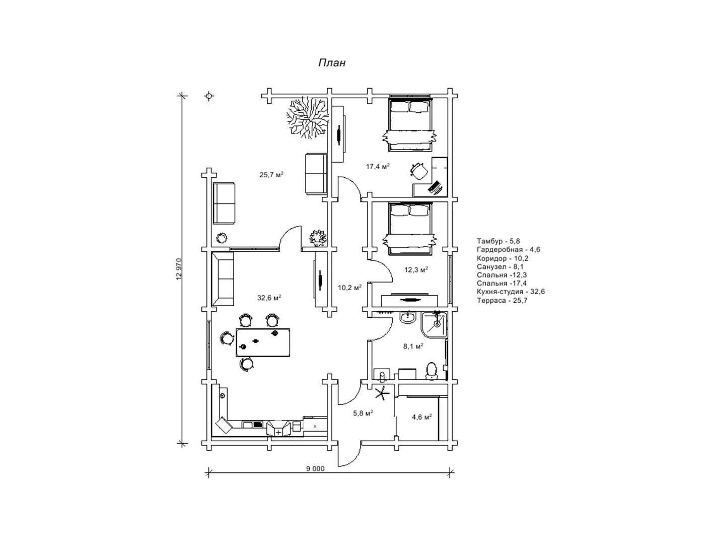 Одноповерховий, дерев’яний будинок з оциліндрованих колод «Адальма» призначений для комфортного проживання та відпочинку родини з 4-х чоловік. Планування будинку характеризується габаритами 12,9 на 9 м і починається з просторої тераси - літній їдальні розміром 25,7 м2. Тераса надійно укрита під скатом покрівлі та відгороджена декоративними бортиками від вулиці, що робить її прекрасним місцем для проведення часу на свіжому повітрі. Навіть в разі дощу тераса захистить від негоди, і в той же час подарує масу насолоди від ефекту присутності в центрі самої стихії. Далі, проходячи в будинок, потрапляємо у велику, світлу кухню-студію з величезними, панорамними вікнами. Є ще один вхід в цей будиночок, облаштований тепловим тамбуром і гардеробом. У зимовий час, коли на терасі буде холодно, можна буде користуватися входом з тепловим тамбуром, який захистить будиночок «Адальма» від попадання холоду всередину приміщень. Дуже комфортним планування роблять дві просторі спальні, великий санвузол. Проект «Адальма» - це комфортний, одноповерховий котедж зі зрубу, в якому затишне планування і справжня близькість природи подарує масу задоволення господарям і гостям родини.