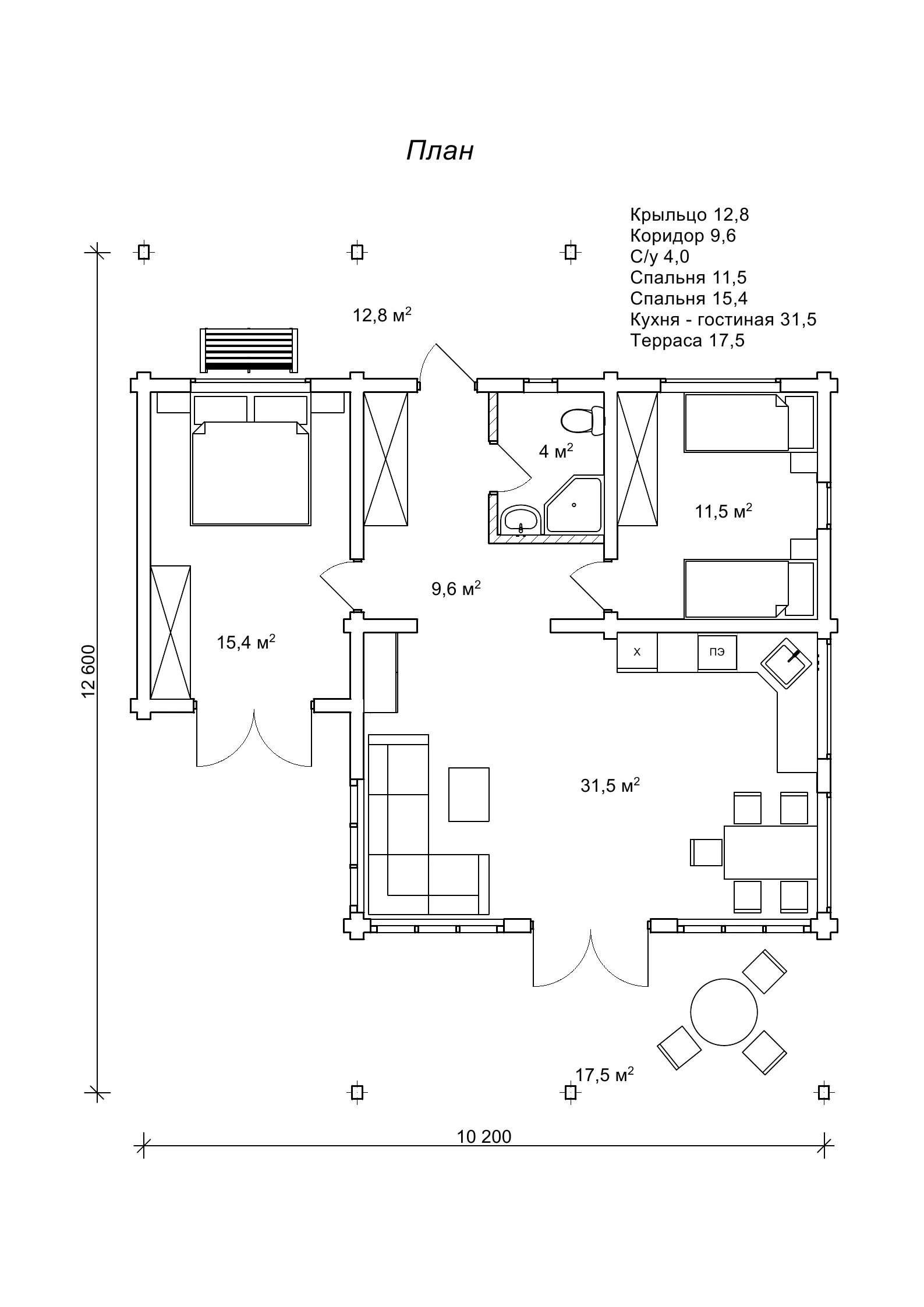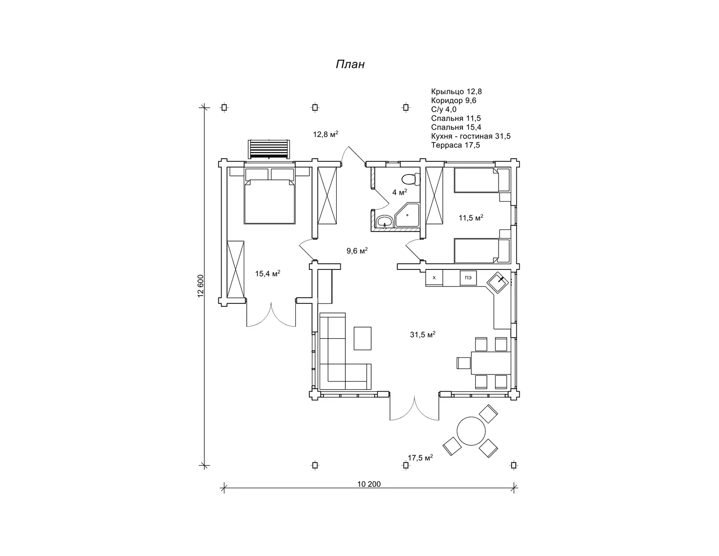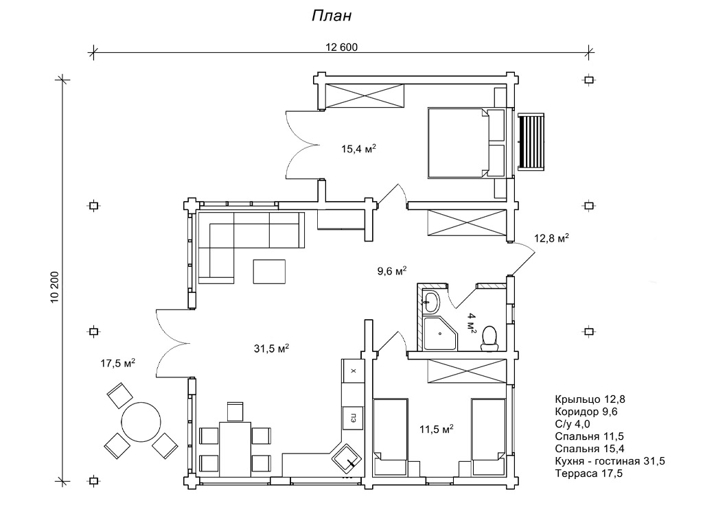 Незвичайний зовнішній вигляд котеджу Арнеда поєднується з продуманим і зручним внутрішнім плануванням приміщень. Біля входу в будинок є досить просторий ганок, яке може грати роль невеликої літньої тераси. А ось з іншого фасаду будинку спроектована простора тераса під цікавим навісом у вигляді окремого даху. Завдяки такому архітектурному рішенню, тераса в проекті Арнеда красиво виділяється, немов окремий будиночок або альтанка. Усередині котеджу сплановано дві спальні, кухня-вітальня і санвузол. Такий варіант проекту чудово підходить для заміської земельної ділянки. У цей будинок можна приїжджати влітку і насолоджуватися затишком і красою, які створюються дерев’яним брусом, з якого виконаний котедж. Проект Арнеда також підходить і для постійного проживання, якщо побудувати його з більшого діаметру бруса.