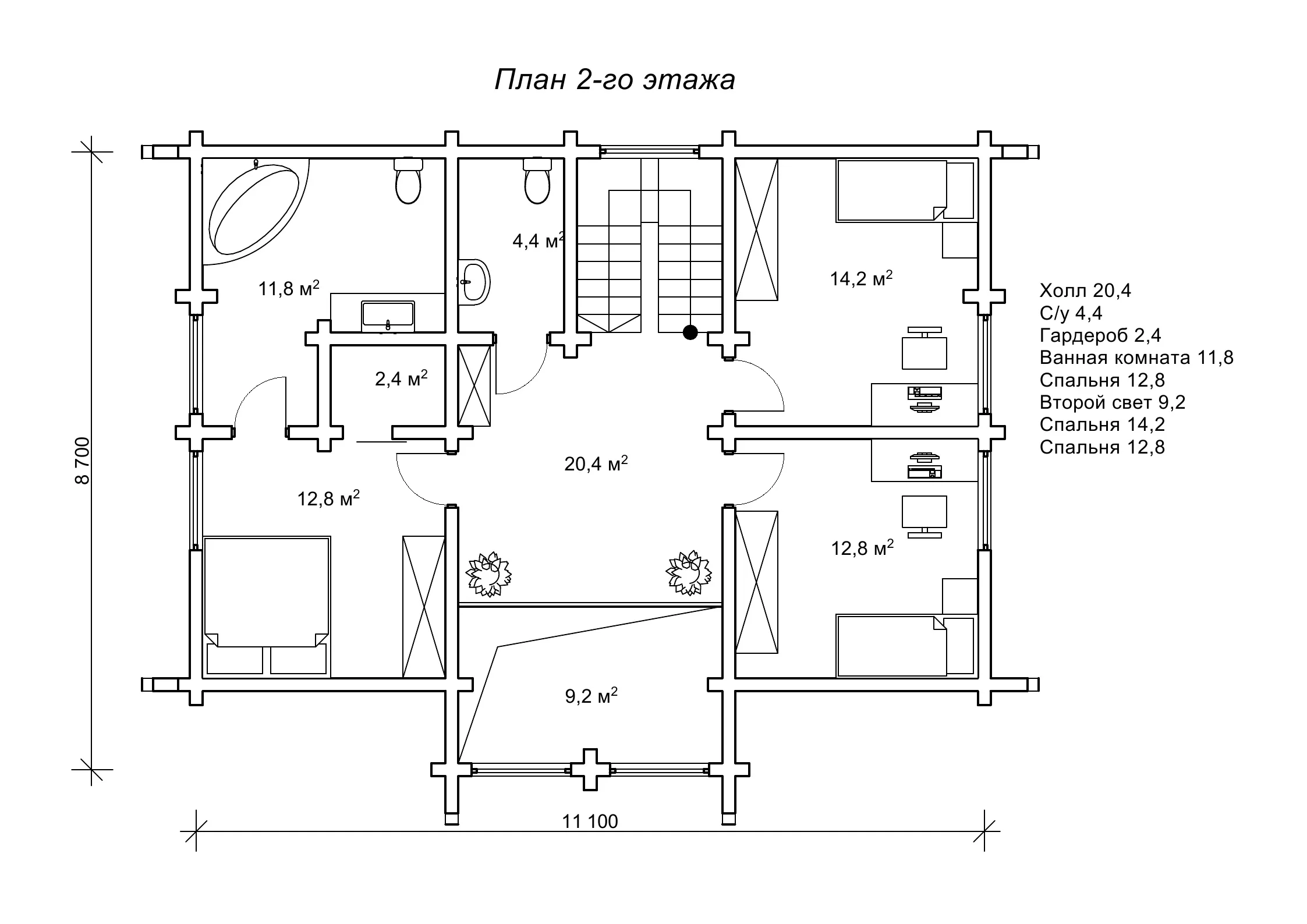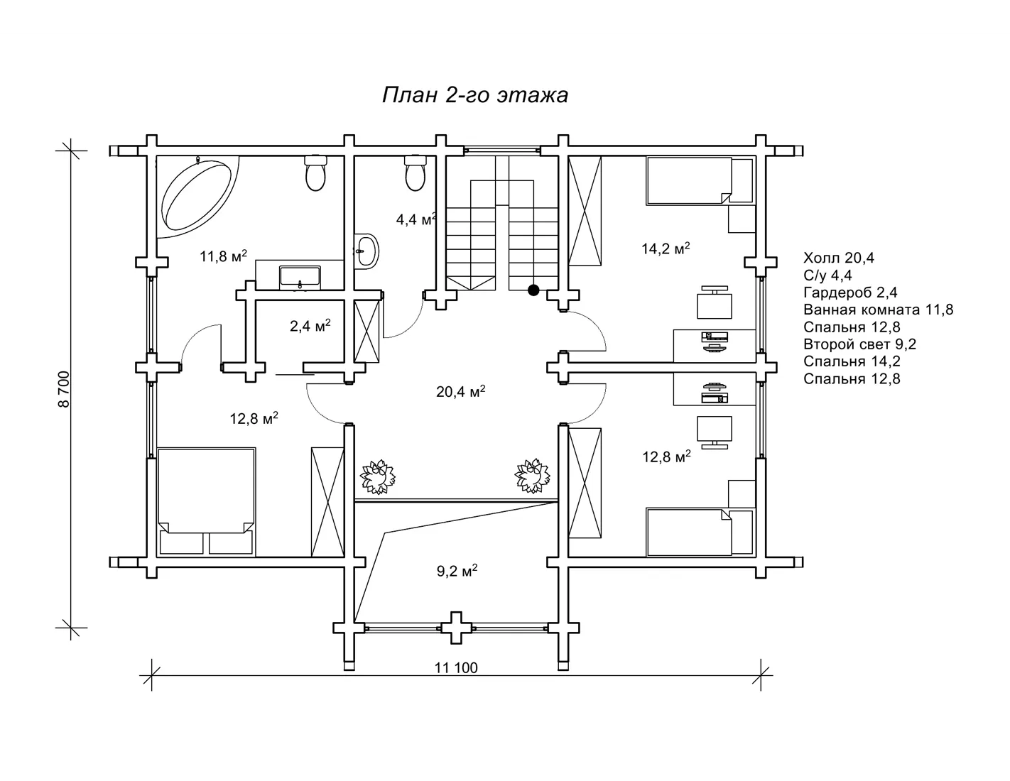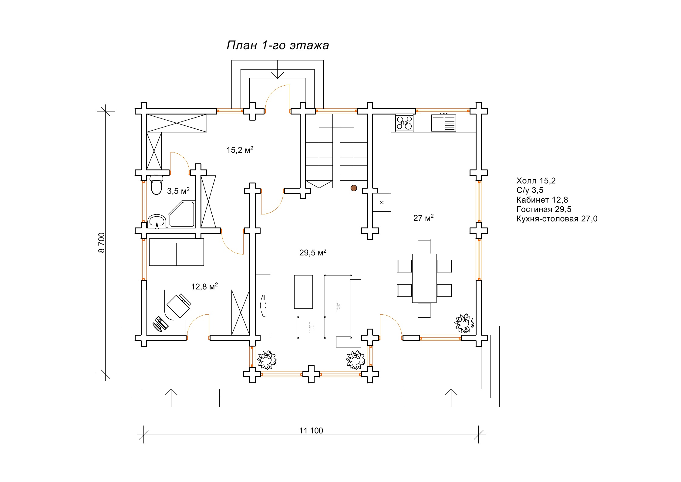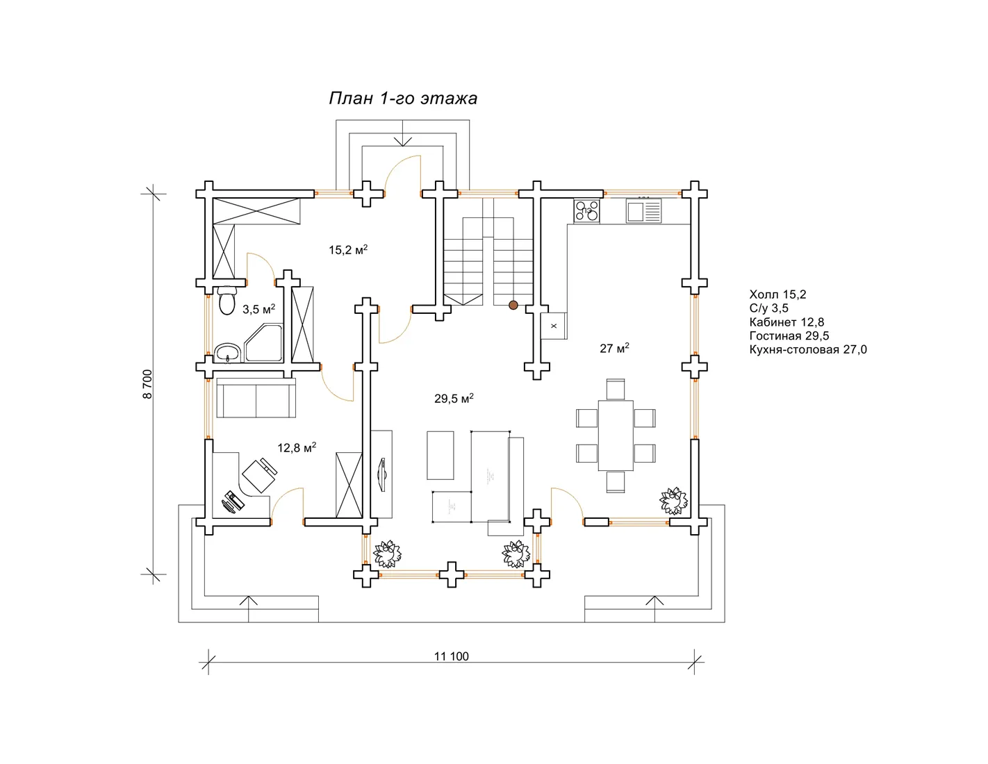 План внутрішніх кімнат дерев’яного будинку 8,7 на 11,1м