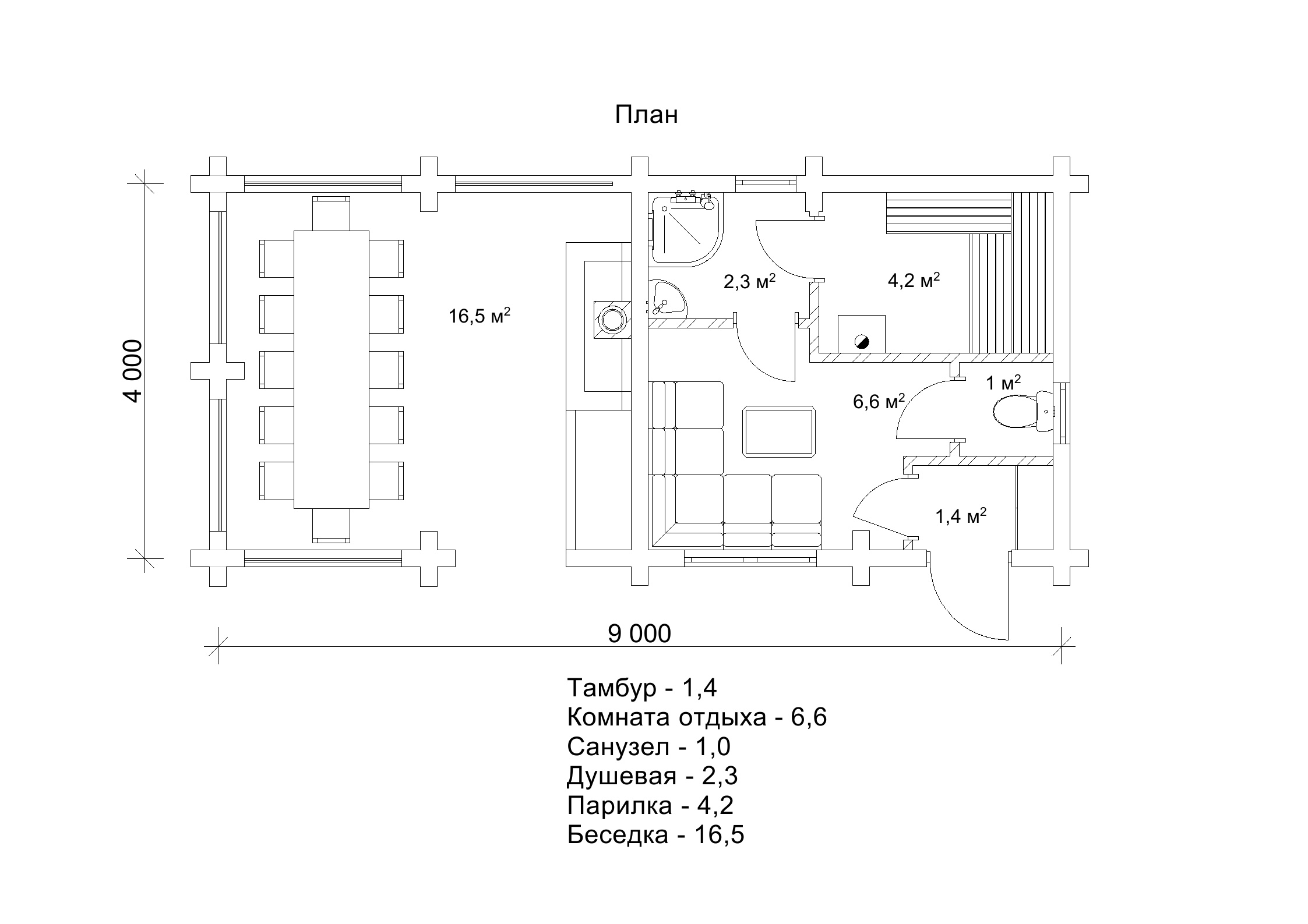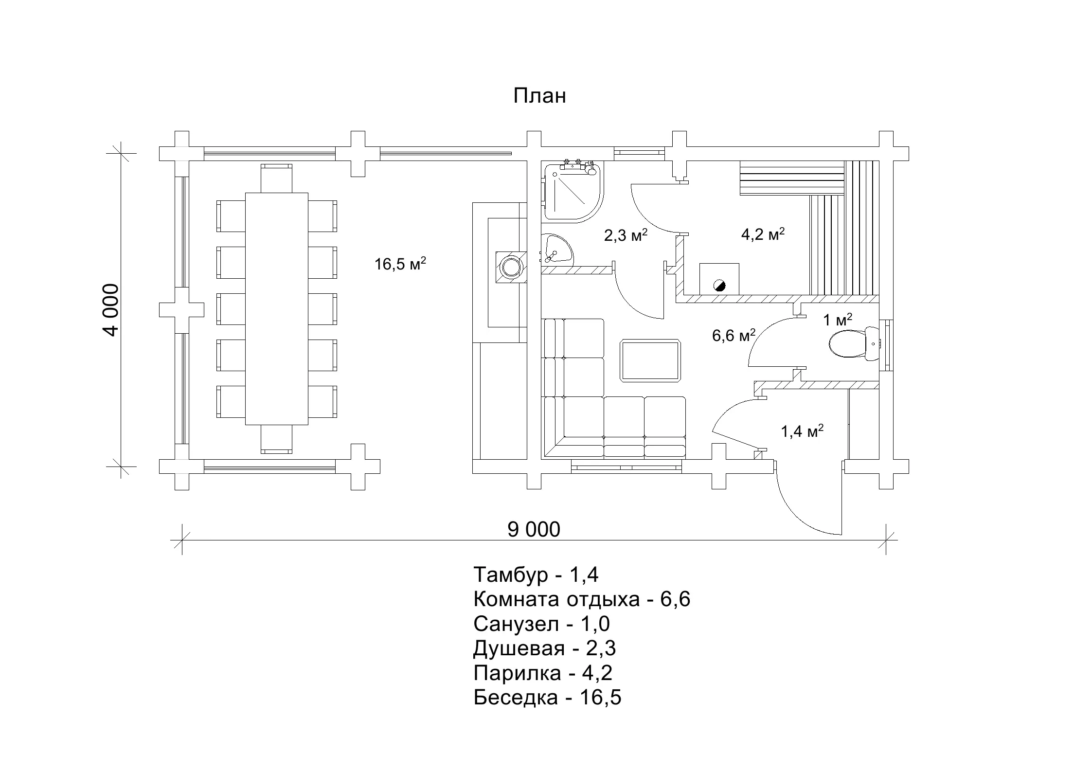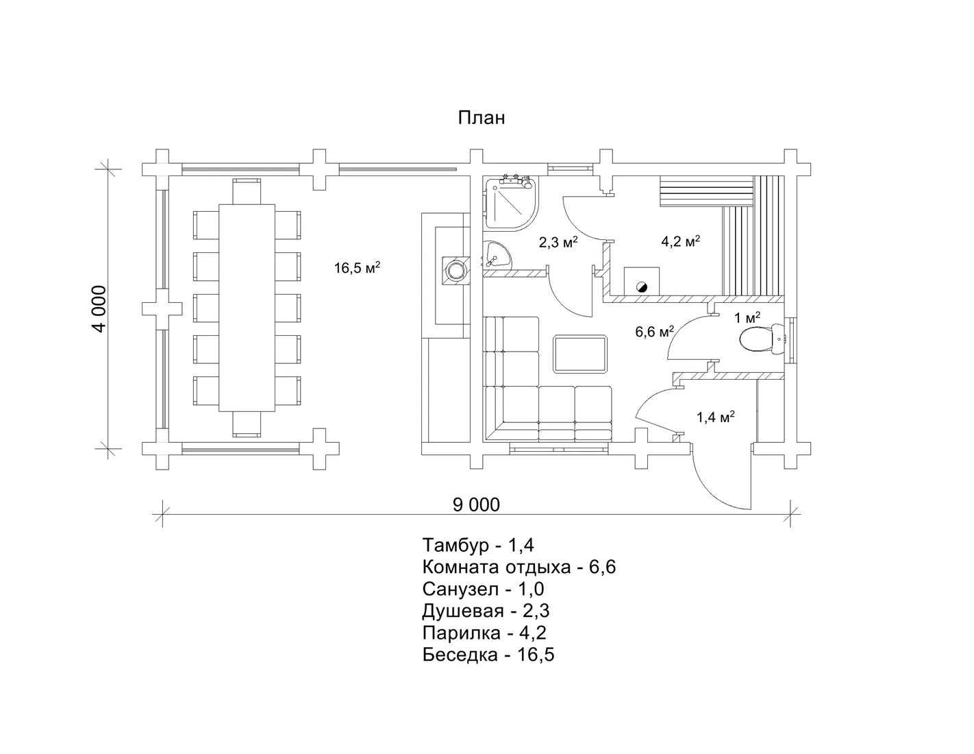 Зруб лазні з альтанкою за проектом «Еліана» має довгасту, прямокутну форму та досить компактні розміри споруди. Параметри 4 на 9 м дозволяють максимально лаконічно розташувати всі приміщення. Площа лазні, включаючи альтанку, складає всього 36 м2 і передбачає такі приміщення, як парилка розміром 4,2 м2, душ, окремий від санвузла, невелику кімнату відпочинку, тамбур і простору альтанку на 16,5 м2. У альтанці передбачено місце для відпочинку компанії із 12 осіб. Проект «Еліана» неймовірно функціональний, практичний та ще й відрізняється привабливим дизайном. Виробництво лазні-зрубу з альтанкою за цим проектом та замовлення будівництва лазні в компанії «Домінант» дозволить отримати улюблене місце відпочинку та заміського дозвілля або комерційно вигідний об’єкт. Такий набір споруд – два в одному проекті, стане вдалим доповненням кемпінгу, бази відпочинку з дерев’яних котеджів чи готельного комплексу.