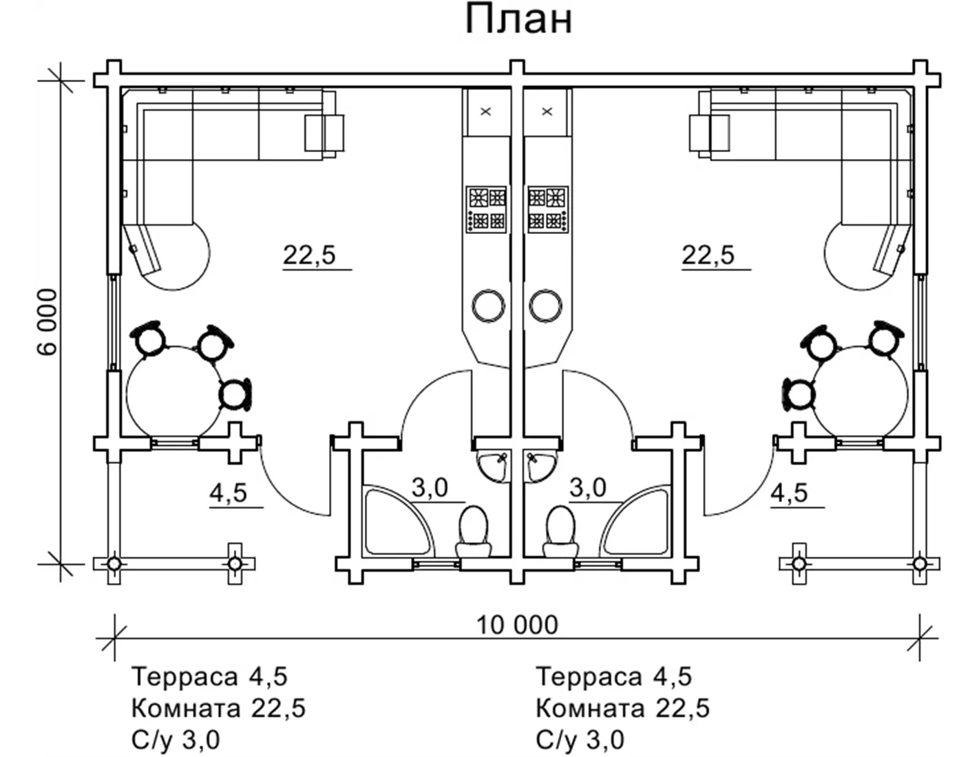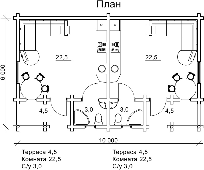 Котедж з бруса має розміри забудови 6 на 10 м, проект розроблений в класичному, лаконічному стилі дерев’яного зрубу без надмірностей так, щоб нічого не відволікало гостей і не заважало їм відпочивати. Планування кожної з двох частин котеджу включає в себе кімнату, санвузол, терасу. Можна сказати, що внутрішнє наповнення даного проекту дає можливість розглядати його не тільки, як частину готельного комплексу.