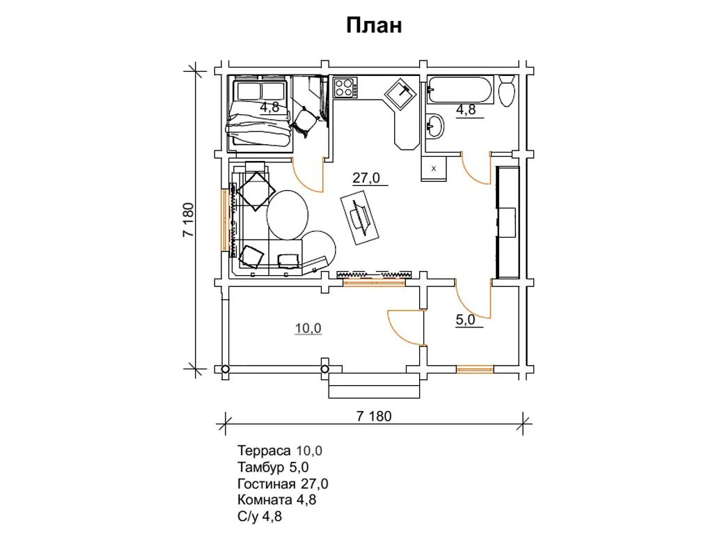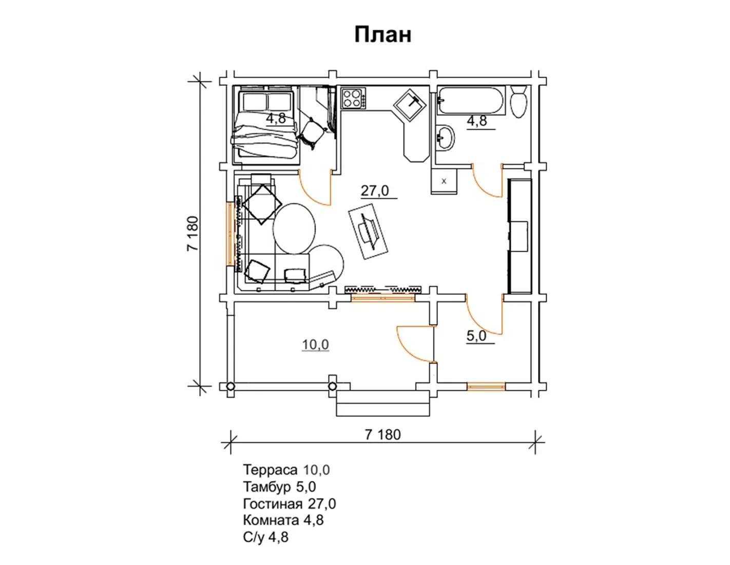 Розміри забудови котеджу 7 на 7 м є класичними для будівель такого типу, це дуже зручні і затребувані габарити для організації оптимальної корисної площі і легкої експлуатації будинку. На першому поверсі будинку розташовується вітальня, кухня, спальня, санвузол, досить містка тераса. Досить простий проект будинку з бруса Ясон також простий і привабливий зовні. У будинку Ясон все відмінно передбачено для комфортного відпочинку і проведення часу. Бажаючи заощадити бюджет і дорогоцінний час, багато наших клієнтів замовляють саме цей дерев’яний будинок під ключ, ціна якого повністю виправдовує очікування, економить витрати часу і грошей.
