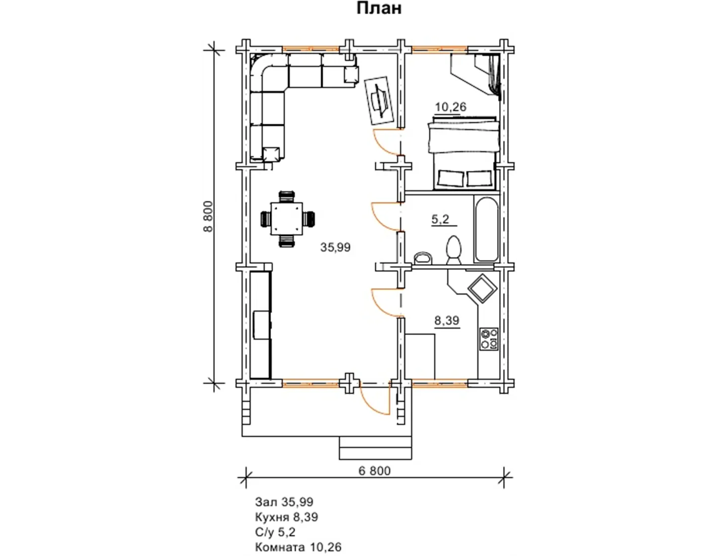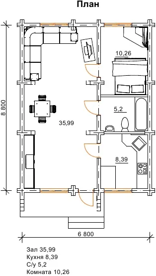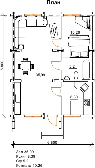 Проект затишного, маленького одноповерхового будиночка Ластівка надає всі необхідні умови для комфорту на заміській ділянці і є економічним і компактним варіантом дерев’яного котеджу, який можна придбати за доступною вартістю. Дуже просторий зал, кухня, санвузол і спальня формують внутрішнє наповнення проекту. Така дача стане оптимальним рішенням для вашої ділянки, а величезний зал дозволить запрошувати багато друзів і проводити всі вихідні в своє задоволення. Можна купити цей дерев’яний будинок недорого, і він відмінно послужить як дача або постійне житло для невеликої сім’ї.