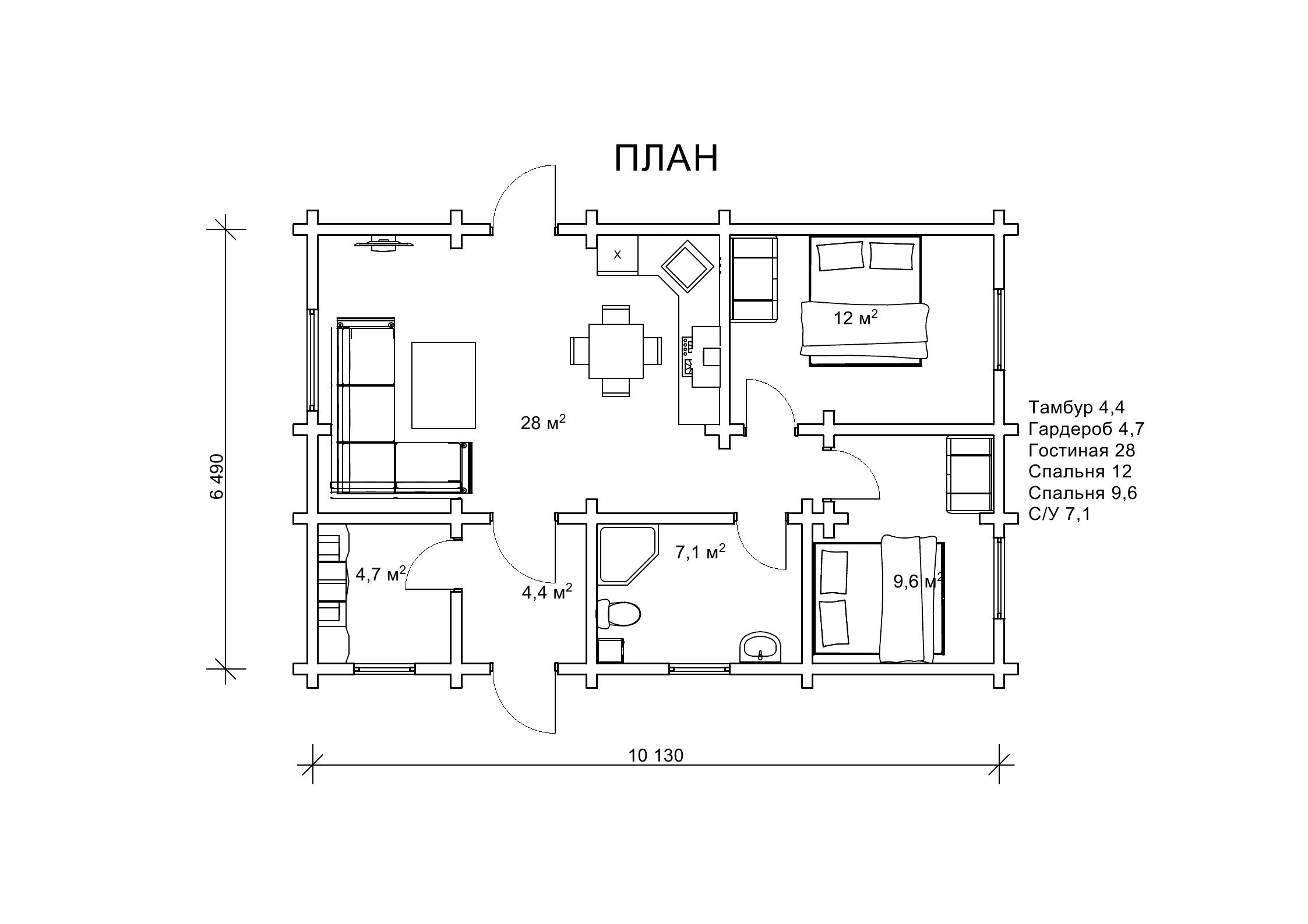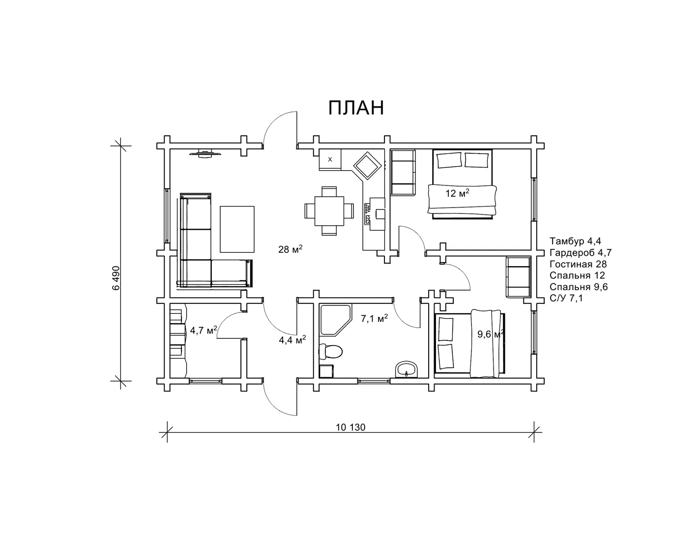 Одноповерхова дача з оциліндрованих колод Мальвег dominant-wood.com.ua/uk/proekty/601-malveg 6,4 на 10,1 м відрізняється зручним і функціональним наповненням. Планування будиночка включає тамбур, гардероб, вітальню з кухонним куточком, дві спальні і санвузол. У такому дачному котеджі можна проживати не тільки в літній сезон, в такому будиночку буде тепло і комфортно цілий рік, якщо ви передбачливо побудуєте його з бруса діаметром 200-220 мм.
