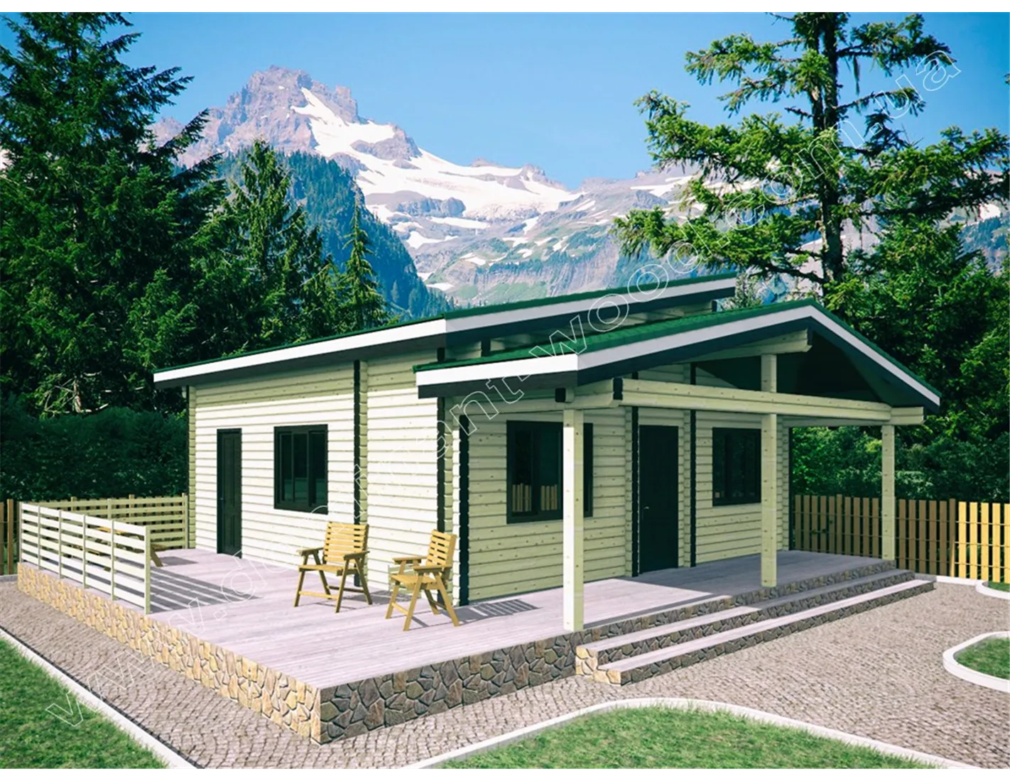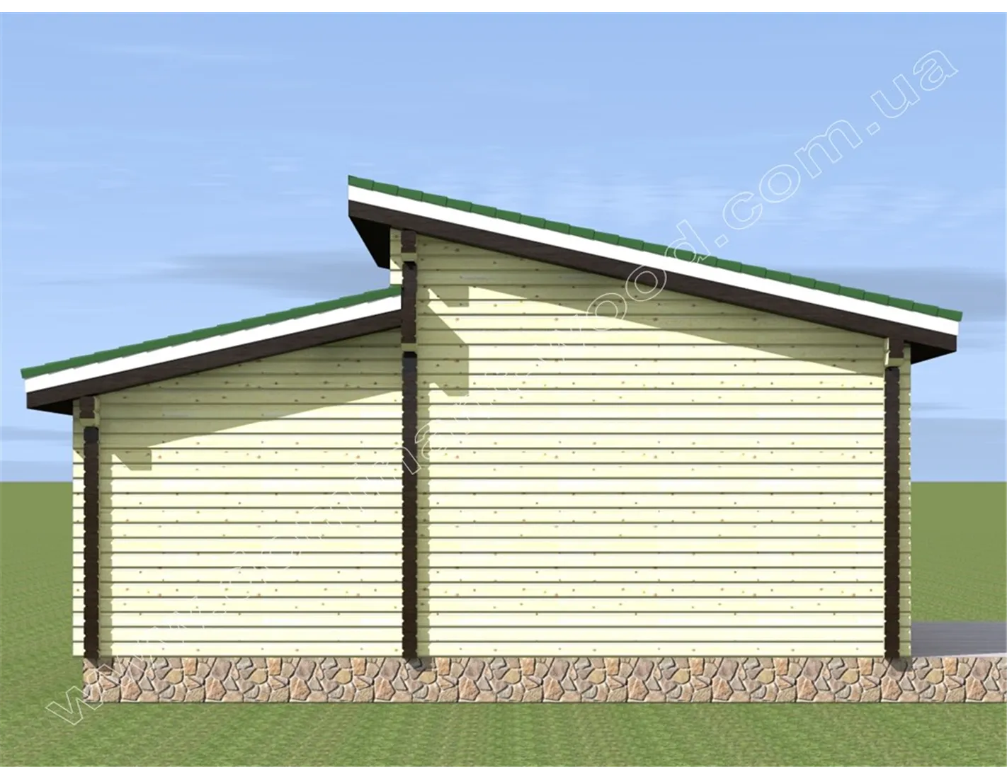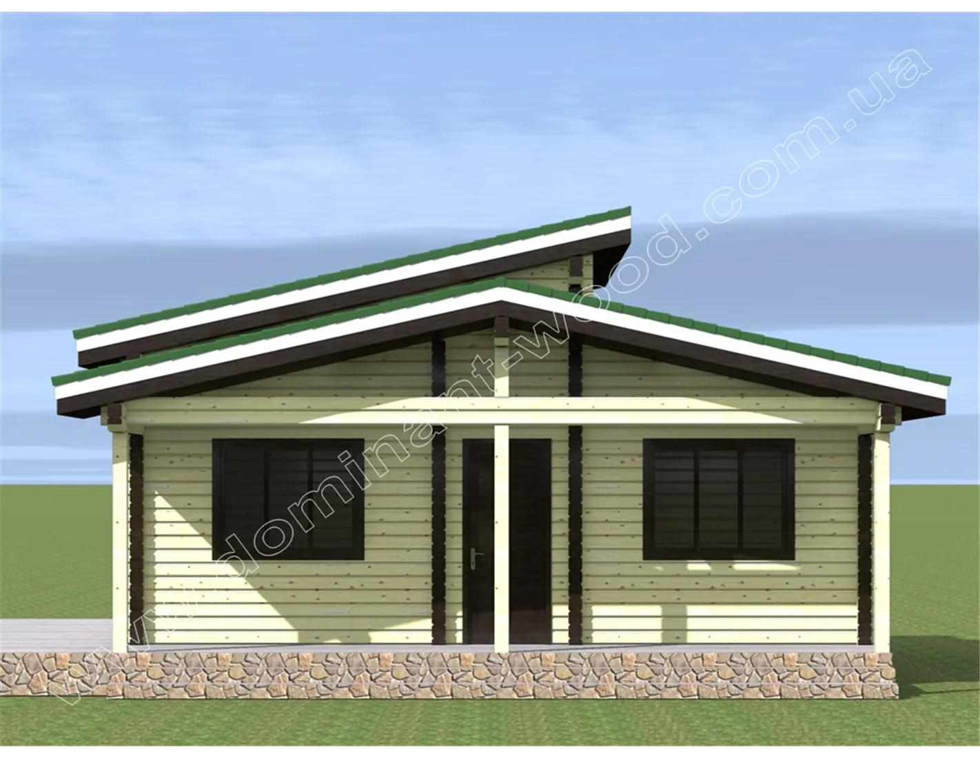 Проект дачного котеджу з сухого профільованого брусу за проектом «Арнеда2» стане відмінним вибором для тих, хто цінує вишуканий зовнішній стиль і зручний внутрішній дизайн. Оригінальний дачний будиночок з незвичайним дахом «Арнеда2» був створений на основі одного з найпопулярніших проектів від компанії «Домінант» в стилі модерн - «Арнеда». У новому виконанні ми бачимо великі вікна однакових розмірів, які симетрично розташувалися на головному і бічному фасадах будинку. Дизайн «Арнеда2» в цілому характеризується прямолінійними архітектурними лініями і простими формами. Цікаву родзинку у вигляді різнорівневого даху ми все ж залишили, тим самим розбавивши суворий вигляд класичного зрубу.