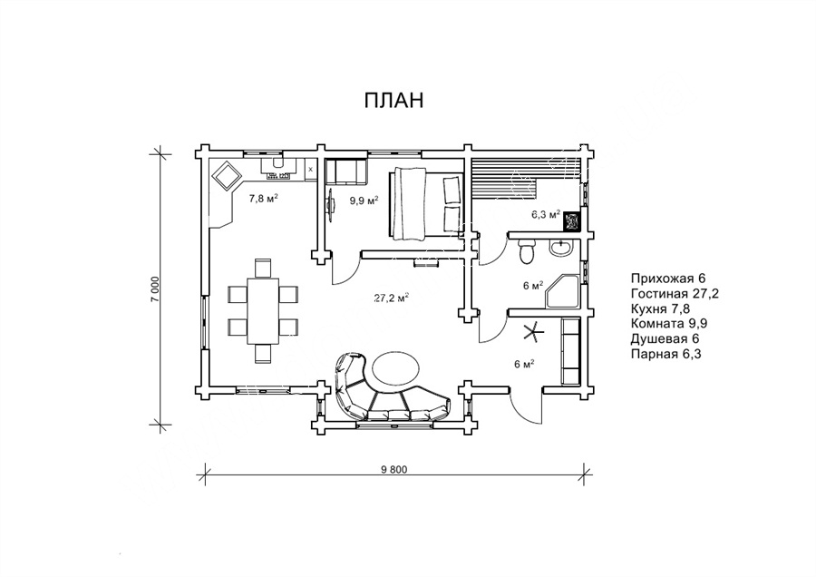 Проект Кароліна чудово поєднує стильний дизайн екстер’єру з внутрішнім комфортом і функціональністю. Планування цього будинку-лазні включає передпокій, вітальню, кухню, кімнату, душову та парну. Таким чином, ми пропонуємо оптимальний варіант економії на будівництві і оснащенні окремої лазні на своїй присадибній ділянці, поєднуючи два проекти в одному - будинок і лазню. У зв’язку з цим саме цей проект дуже затребуваний на сьогоднішній день.