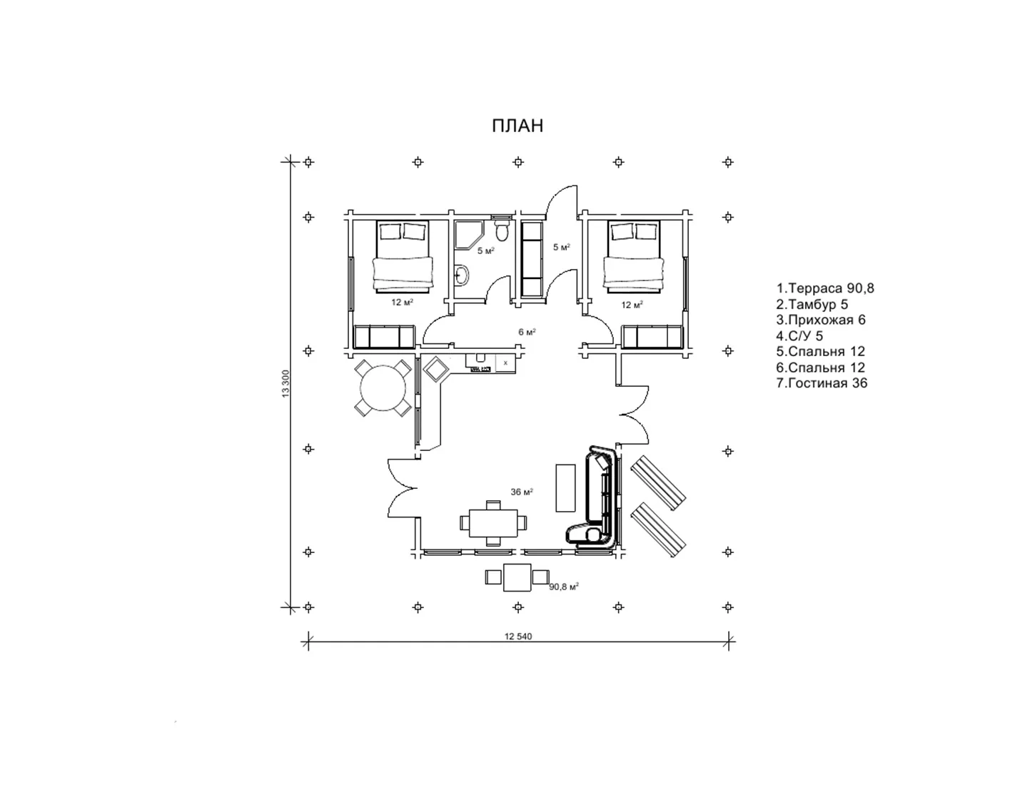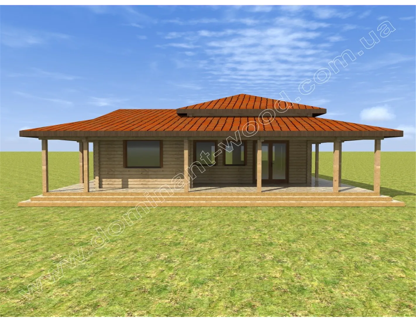 Професійні проектанти компанії «Домінант» dominant-wood.com.ua/uk/ передбачили на терасі дві просторі зони, які дозволяють влаштувати застілля або вечірку, в той же час для бажаючих поспілкуватися віч-на-віч теж знайдеться місце. На торцевій частині тераси виділено місце для ранкової кави з оглядом оточуючих красот або вечірнього чаювання за романтичною бесідою. Таке розташування тераси по контуру будинку візуально додає всьому проекту простору і легкості і, разом з тим, захищає внутрішні приміщення від прямих сонячних променів, адже вітальня всередині будинку спланована теж дуже цікаво, а саме з тристороннім освітленням.