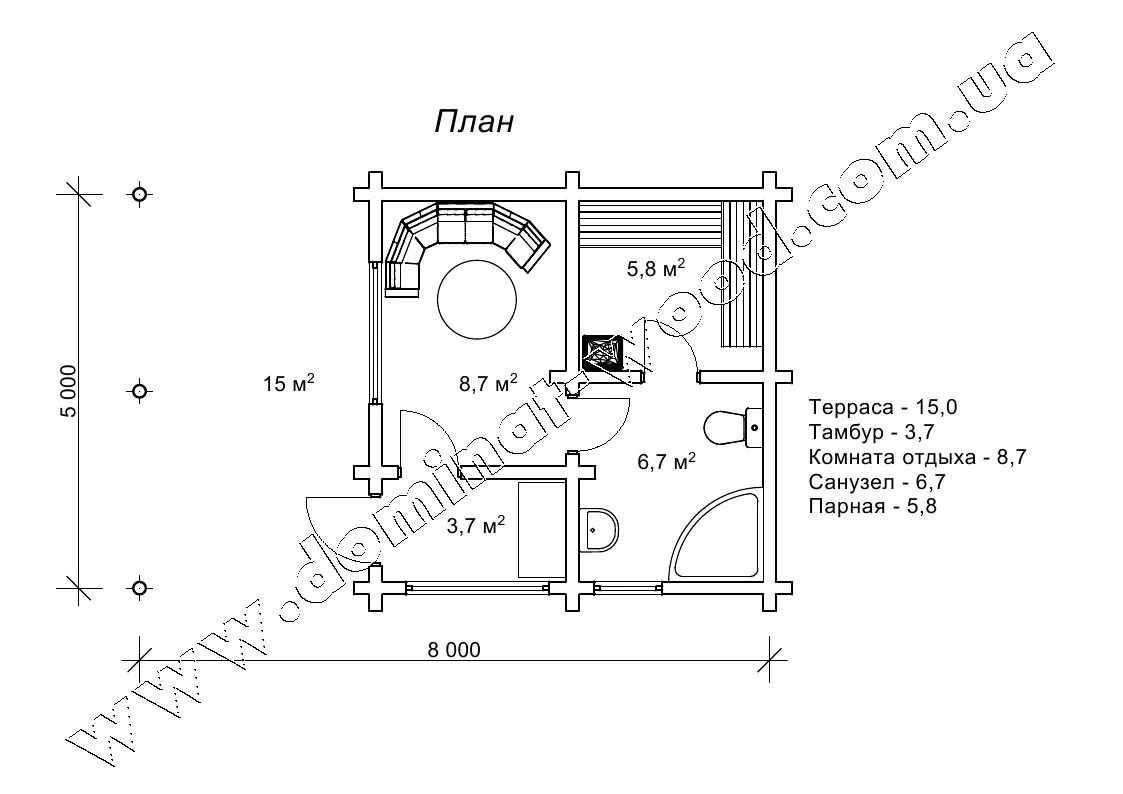 Проект лазні з колод «Дюна» 5х8 м