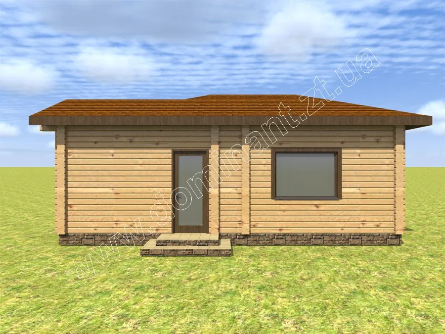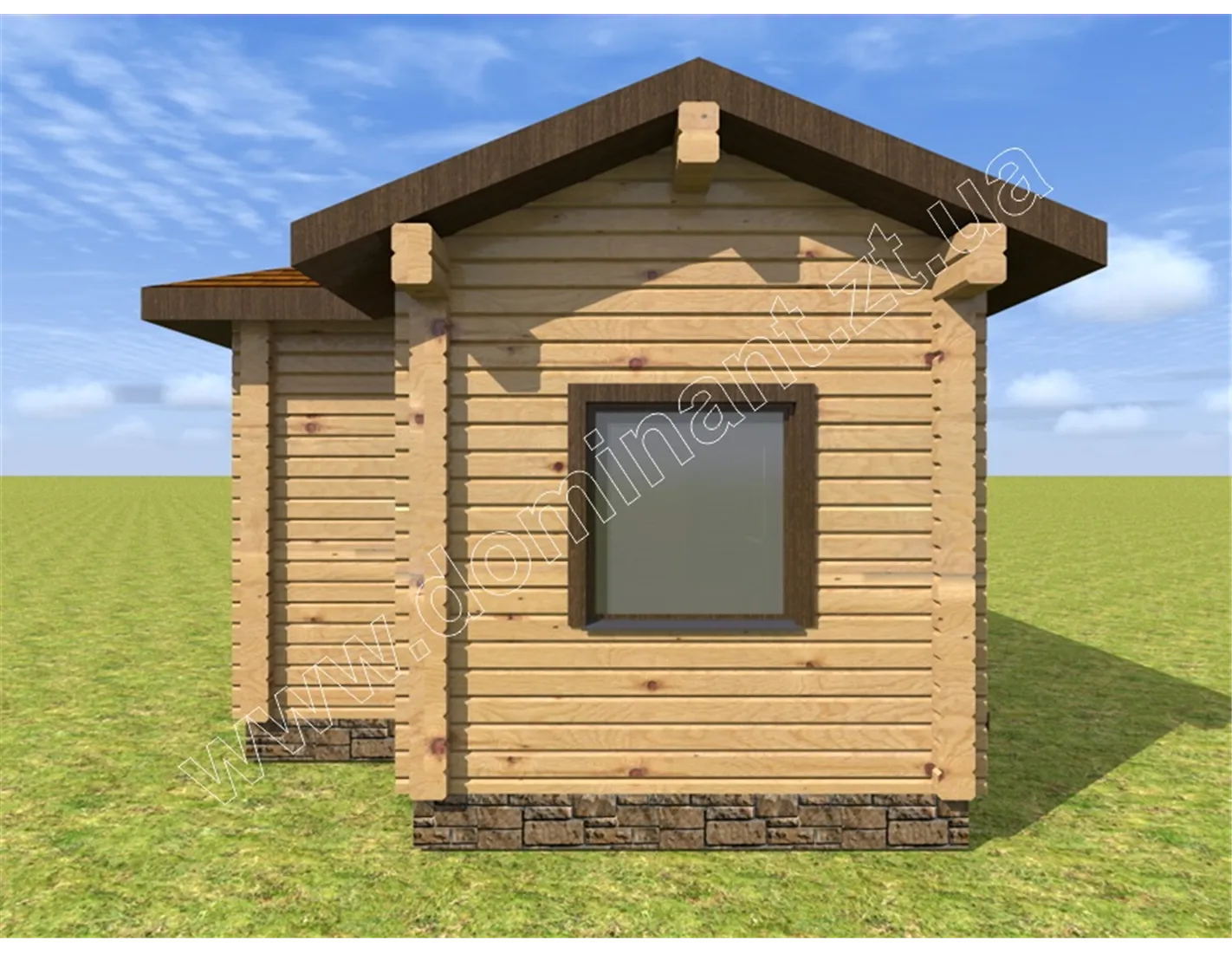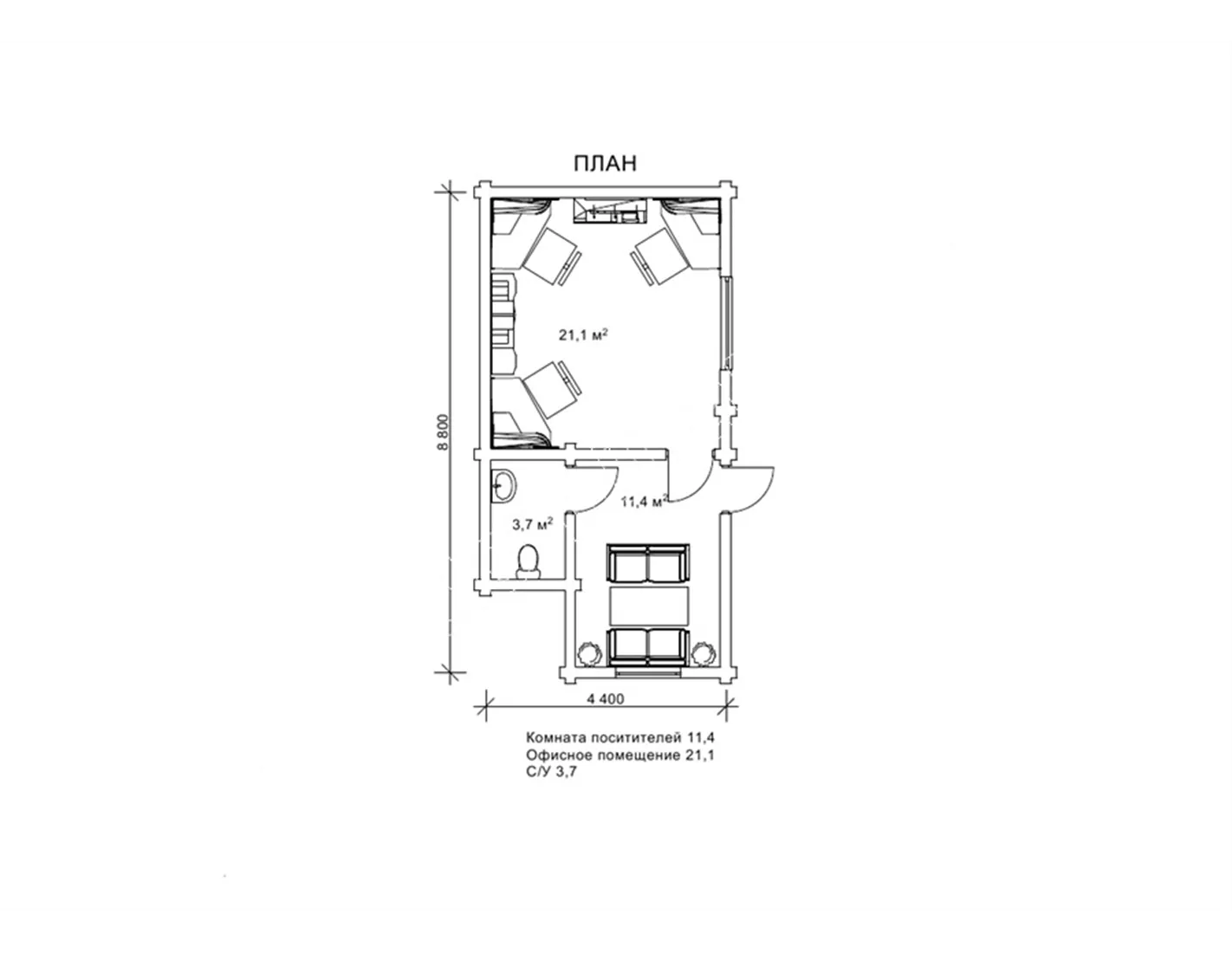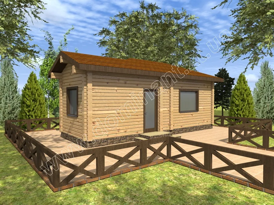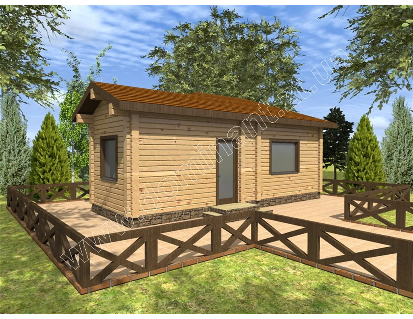 Такий проект буде актуальний на території бази відпочинку або банного комплексу. Вельми стриманий і компактний будинок, повністю виконує функції прийому відвідувачів і їх обслуговування. Оборудуючи кімнату для відвідувачів акваріумом або натуральними меблями, ви створите своїм гостям надзвичайний комфорт і затишок, навіть при недовгому відвідуванні вашого офісу. В такому офісі з легкістю розташуються три-чотири співробітника.
