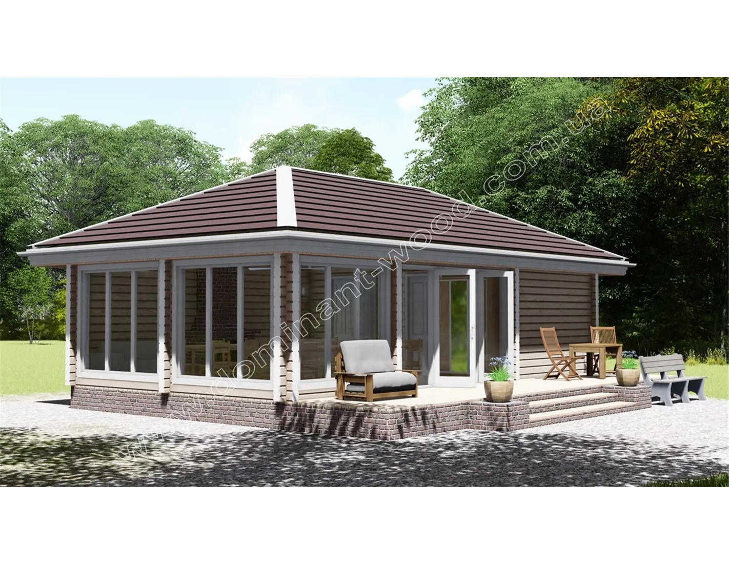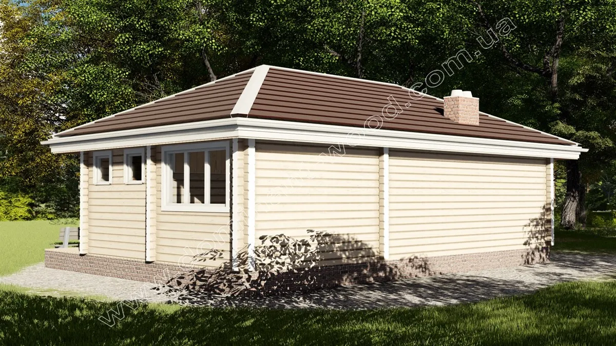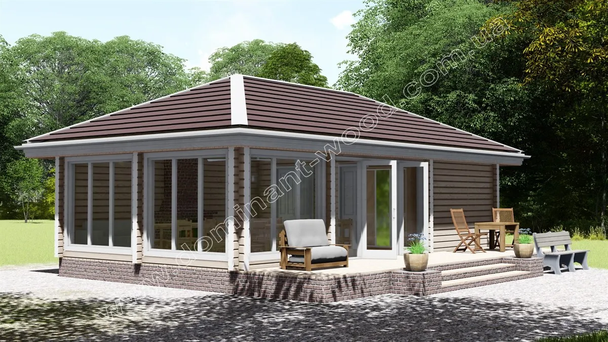 Ефектний, стильний будиночок «Міліан» під масивним чотирисхилим дахом відразу привертає увагу. Це проект дерев’яного павільйону із сухого, профільованого бруса, який надає дизайну чітких контурів, особливої вишуканості та акуратності. Великі, панорамні вікна на фасадах прикрашають будівлю та надають йому ексклюзивного, дорогого вигляду. Гарний, яскравий дизайн, прогресивна технологія висушування дерев’яного стінового матеріалу в прес-вакуумних камерах, що сприяє надійності та довговічності будівлі, робить проект павільйону-кафе вигідним придбанням для господаря ресторанного бізнесу чи бази відпочинку. Для тих, хто хоче розширити сферу послуг, дерев’яний павільйон-кафе «Міліан» надасть відмінні умови для гостей закладу. Крім того, планування приміщень дозволяє розглядати кафе як самостійно функціонуючий комерційний об’єкт.