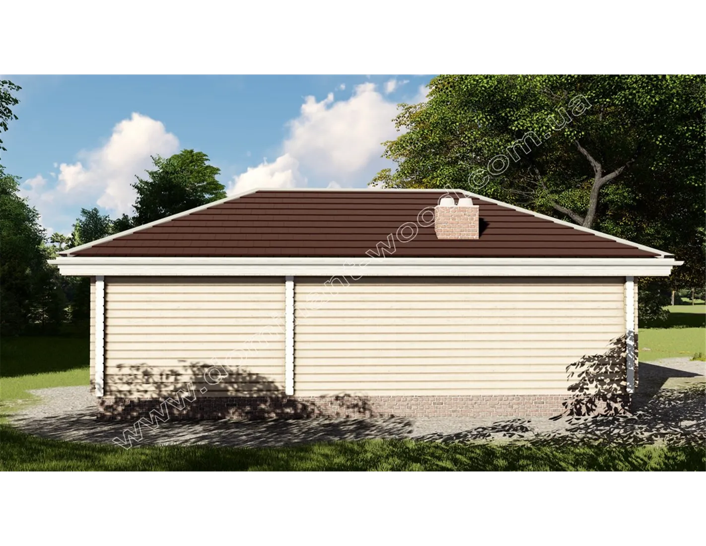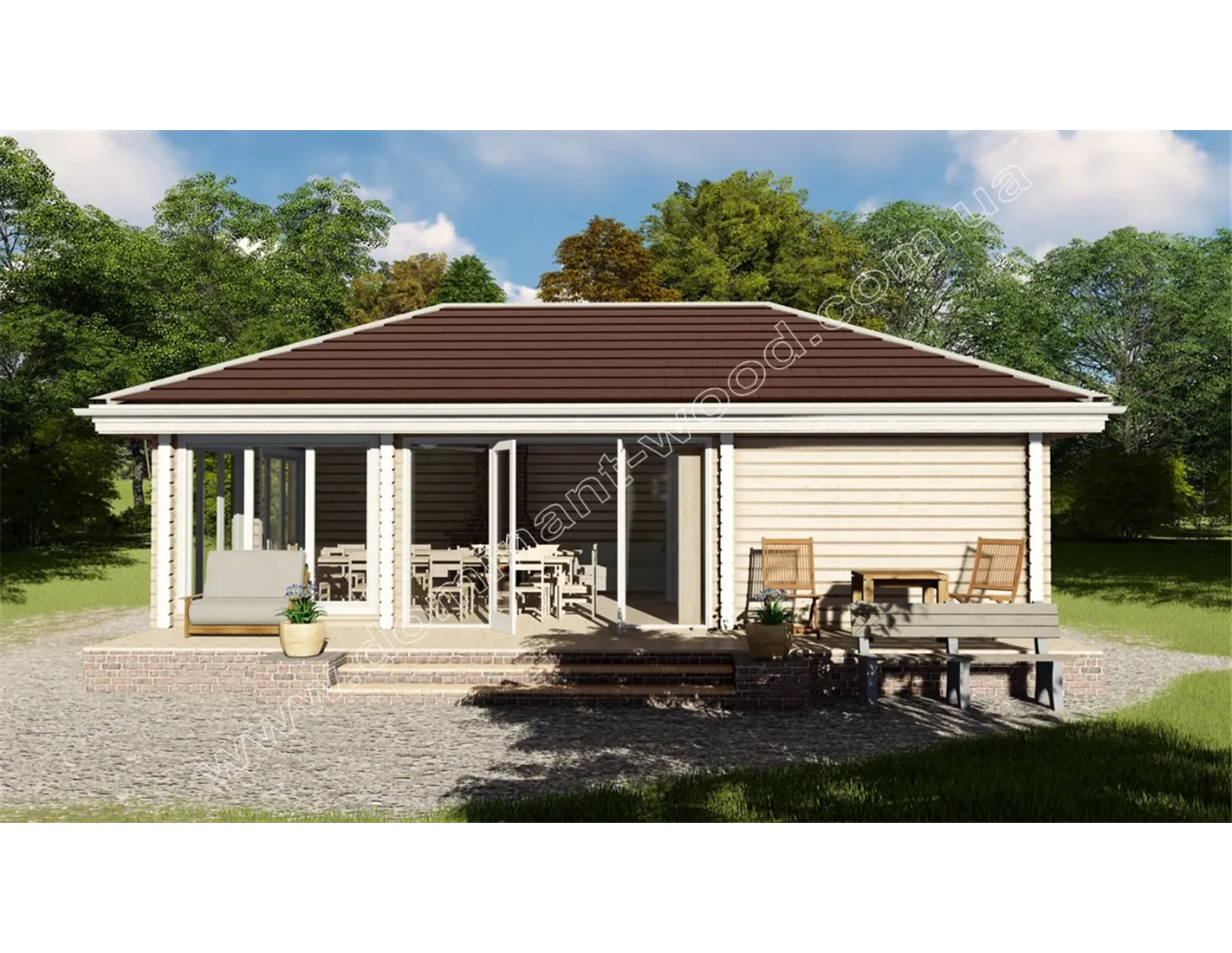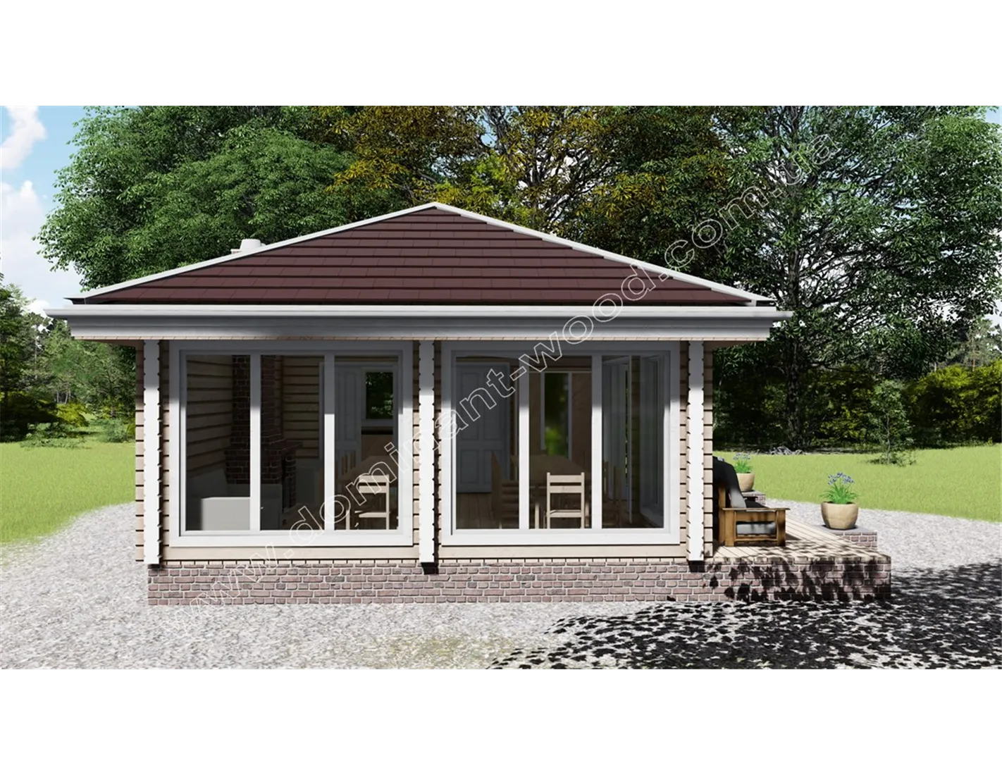 Ефектний, стильний будиночок «Міліан» під масивним чотирисхилим дахом відразу привертає увагу. Це проект дерев’яного павільйону із сухого, профільованого бруса, який надає дизайну чітких контурів, особливої вишуканості та акуратності. Великі, панорамні вікна на фасадах прикрашають будівлю та надають йому ексклюзивного, дорогого вигляду. Гарний, яскравий дизайн, прогресивна технологія висушування дерев’яного стінового матеріалу в прес-вакуумних камерах, що сприяє надійності та довговічності будівлі, робить проект павільйону-кафе вигідним придбанням для господаря ресторанного бізнесу чи бази відпочинку. Для тих, хто хоче розширити сферу послуг, дерев’яний павільйон-кафе «Міліан» надасть відмінні умови для гостей закладу. Крім того, планування приміщень дозволяє розглядати кафе як самостійно функціонуючий комерційний об’єкт.
