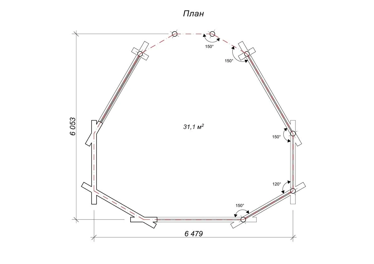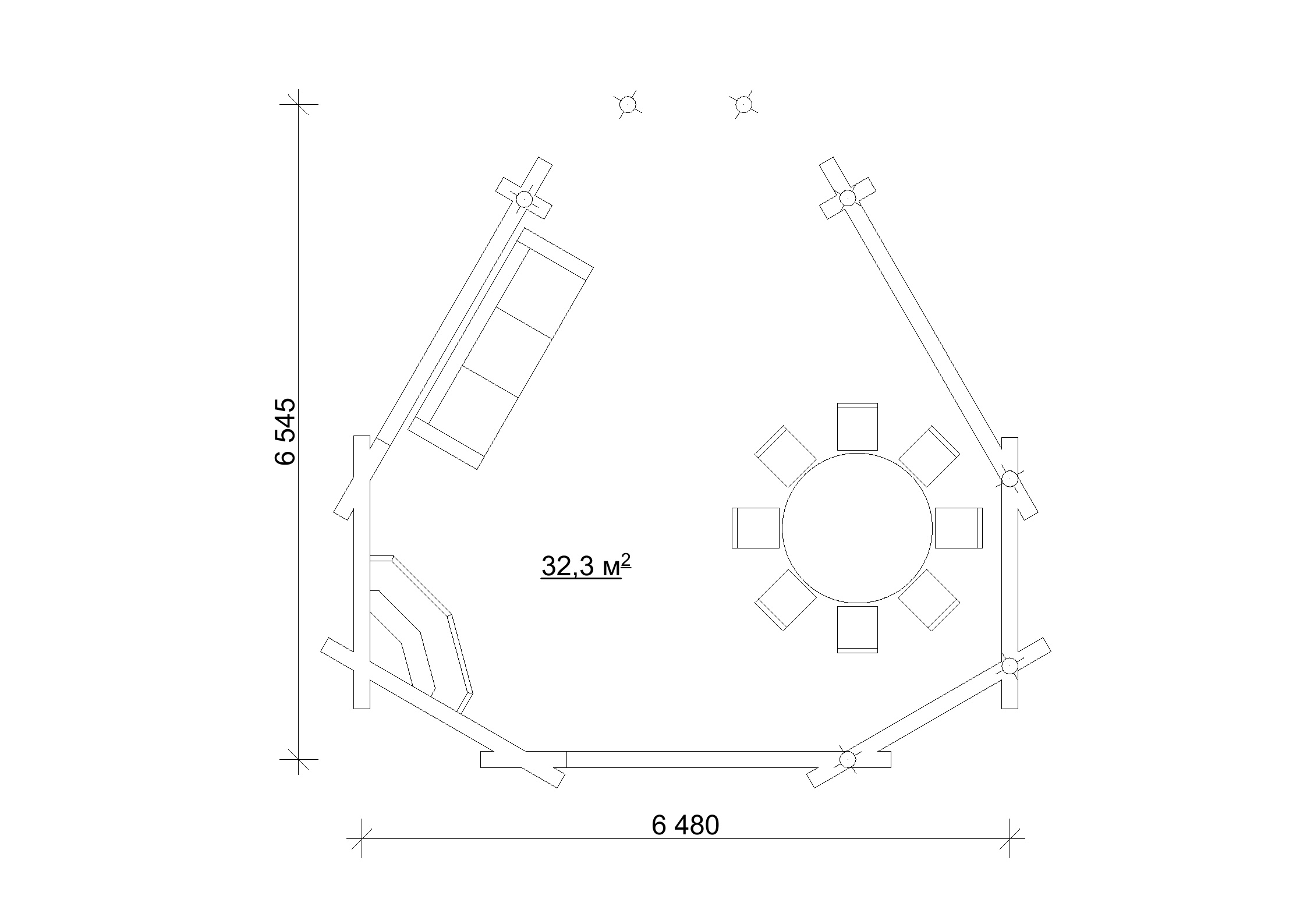 За планом восьмигранной альтанки «Шампурі», видно, що вона спроектована в габаритах 6,5 на 6,4 м, тобто фактично її сторони є рівноцінним. Але за рахунок цікавої «каплеподібної» форми, що нагадує діамант, альтанка візуально здається трохи подовженою. Внутрішня площа 32,3 м2 дозволяє вільно розмістити в альтанці круглий стіл на вісім посадочних місць, невеликий диванчик і навіть виділити місце для каміна. Таким чином, зрубова альтанка «Шампурі» являє собою відмінну модель для організації дозвілля, пікніків, застіль і просто прекрасного відпочинку.