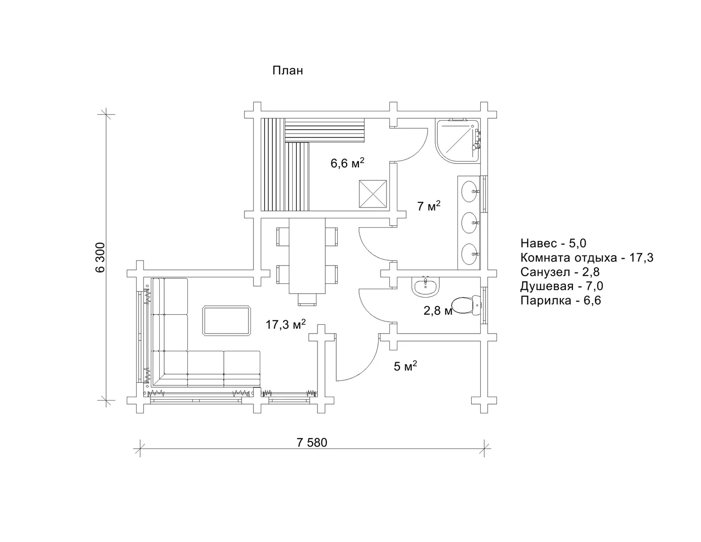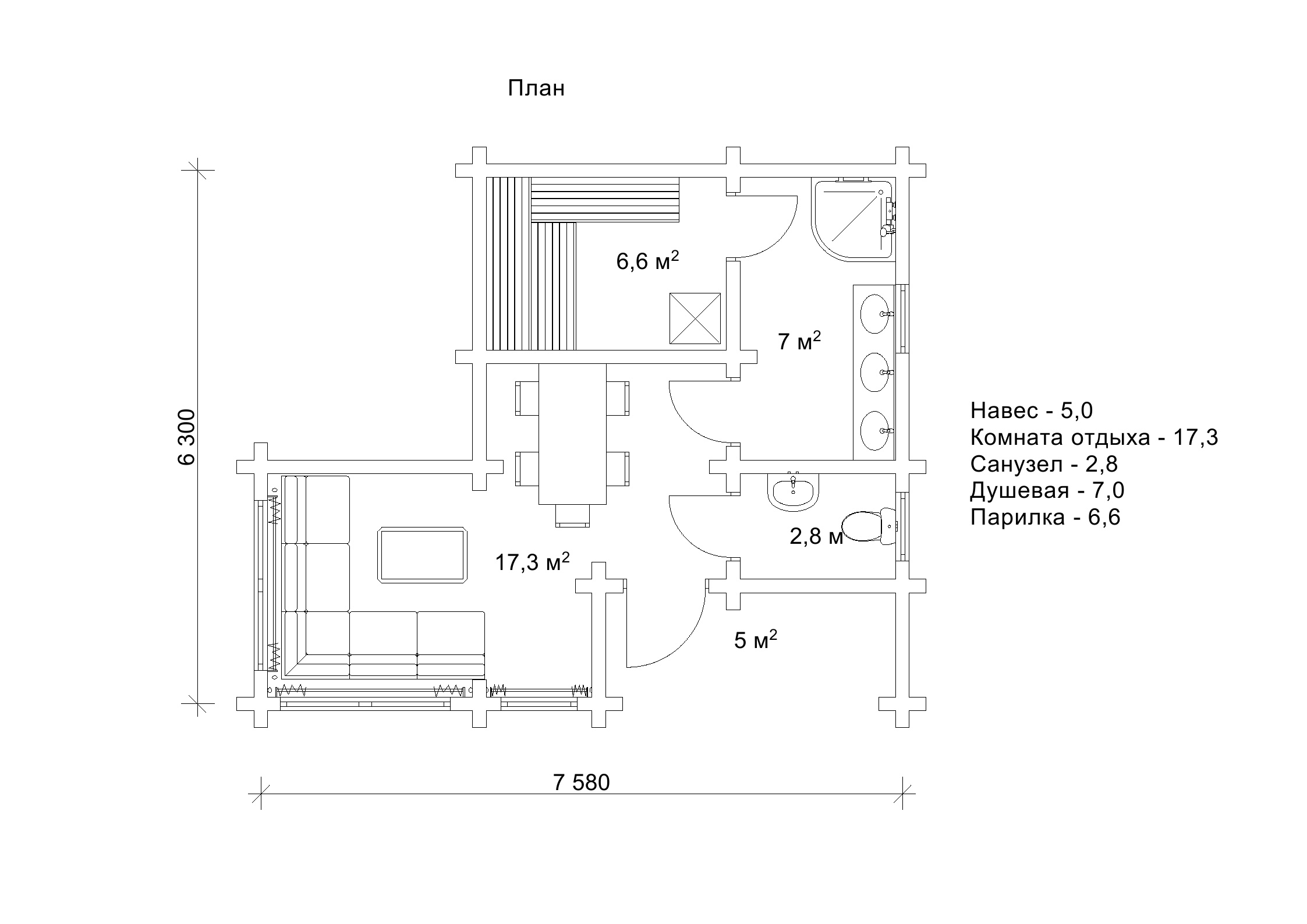 Габарити будівлі за проектом «Евальд» становлять 6,3 на 7,5 м, його компактна площа 38,7 м2 відрізняється максимально функціональним внутрішнім наповненням. Наявність великої парилки розміром 6,6 м2, санвузол з душем та кількома умивальниками, а також комфортна кімната відпочинку на 17,3 м2 дозволяє розглядати цей проект як лазню саме для комерційного використання. Це місце, яке дозволить провести час за лазневими процедурами в максимально сприятливих для здоров’я умовах дерев’яного зрубу. А відпочинок у вітальні прикрашатимуть панорамні вікна, які роблять її схожою на мальовничу, засклену веранду. Компактність споруди, економічність її будівництва та переваги планування – суттєві аргументи на користь інвестування у комерційний зруб лазні «Евальд».
