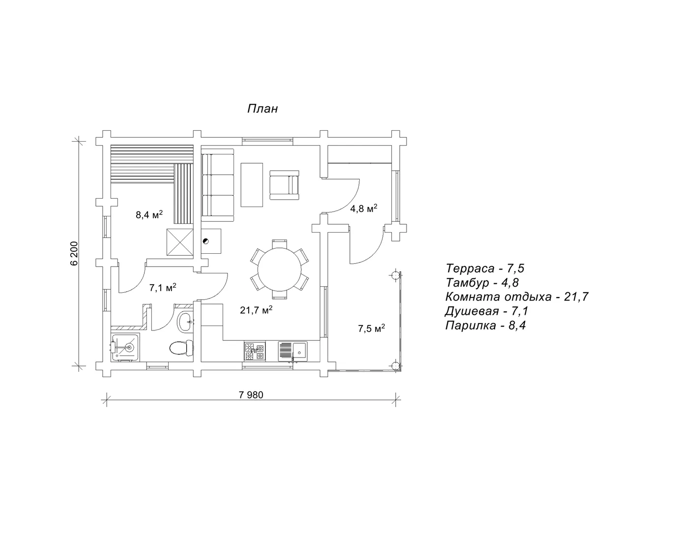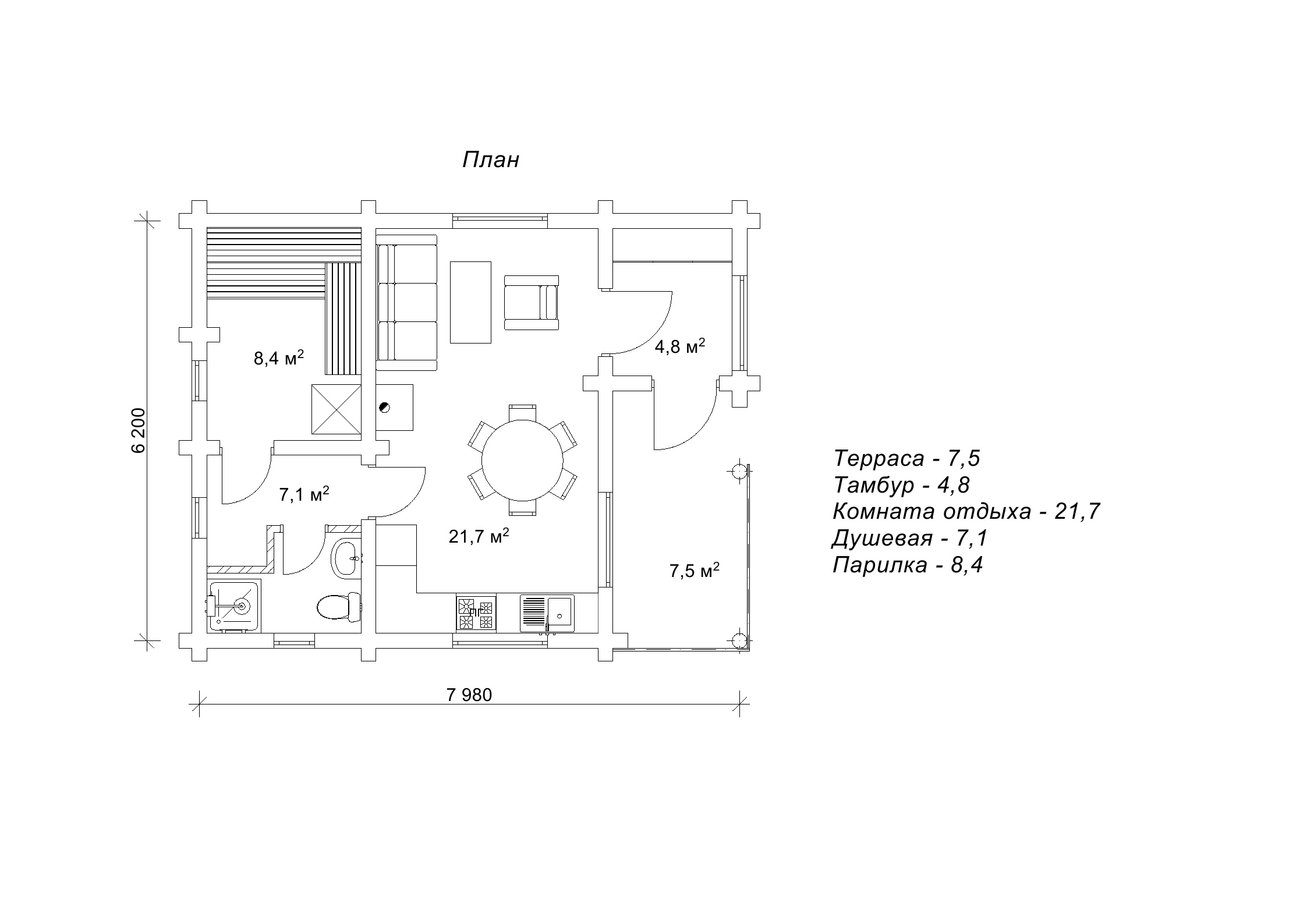 Габарити лазні становлять 6,2 на 7,9 м, а її площа – 49,5 м2. Будівництво зрубу лазні «Міртеш» дозволяє заощадити місце на ділянці та водночас принести море задоволення господарям та гостям лазні. Адже планування проекту передбачає наявність великої парилки розміром 8,4 м2, і тут може одночасно розташовуватись компанія до десяти осіб, не відчуваючи жодного дискомфорту. Поруч із парилкою знаходиться душова та санвузол. А кімната відпочинку площею 21,7 м2 розподіляється на кухонну та лаунж зони. Тут зручно і готувати їжу, і відпочивати у перервах між заходами в лазню. У маленькому тамбурі зручно залишати верхній одяг та взуття, а на літній терасі освіжитися свіжим повітрям після сильного розігріву. На виробництво зрубу лазні 6,2 на 7,9 м за проектом «Міртеш» заводу «Домінант» потрібно приблизно місяць, а на зведення дерев'яної конструкції тиждень. Інші деталі та питання щодо замовлення будівництва дерев'яної лазні ви можете уточнити у менеджерів відділу роботи з клієнтами, контакти якого є у відповідному розділі сайту.
