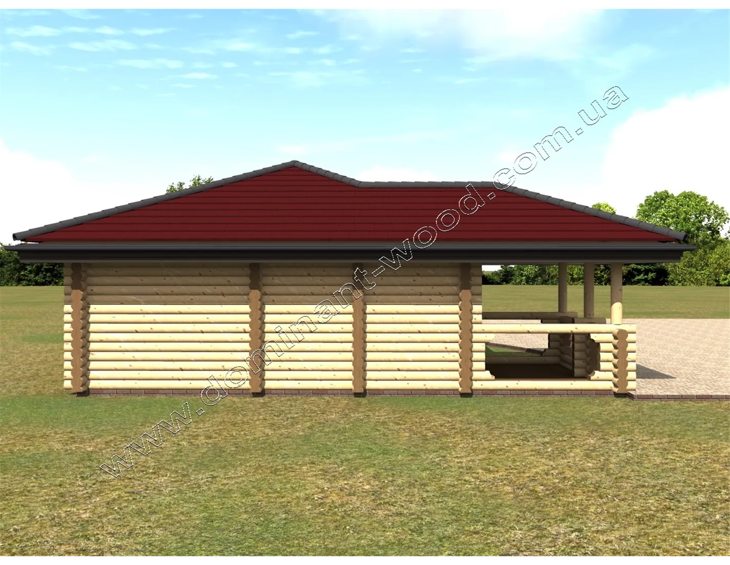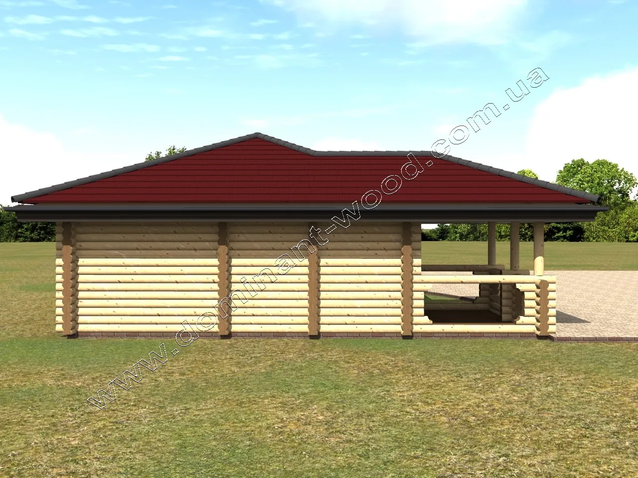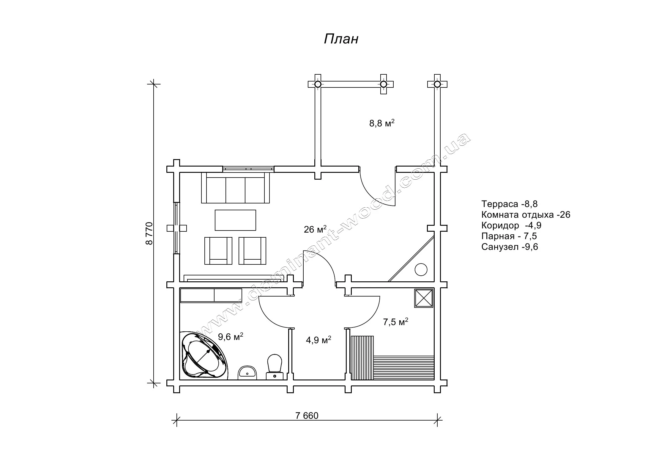 У проекті зрубу баньки передбачено весь набір необхідних приміщень: парилка 7,5 м2, санвузол з душовою, кімната відпочинку і тераса. Компактні розміри баньки 8,7 на 7,6 м дозволяють помістити споруду на маленькій території. Вона стане відмінним доповненням як до житлового будинку, так і до готельного комплексу. Баньку по проекту «Бадріна» компанія «Домінант» вже будувала в Азербайджані, про що можна почитати в нашій публікації «Будівництво лазні в Азербайджані» і подивитися цікаві фото з місця будівництва.