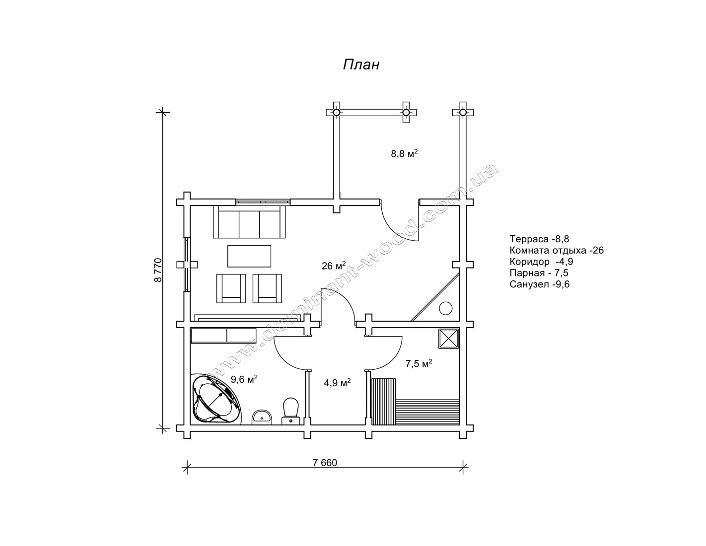 Проект лазні-зрубу «Бадріна», 56,8 м2