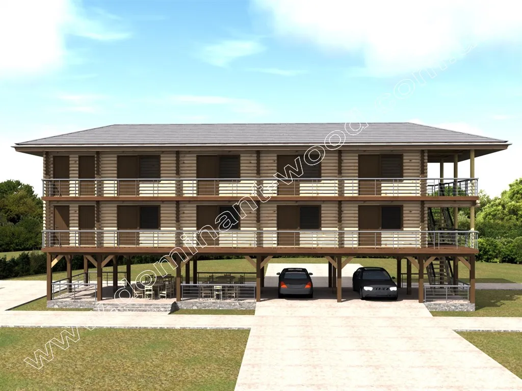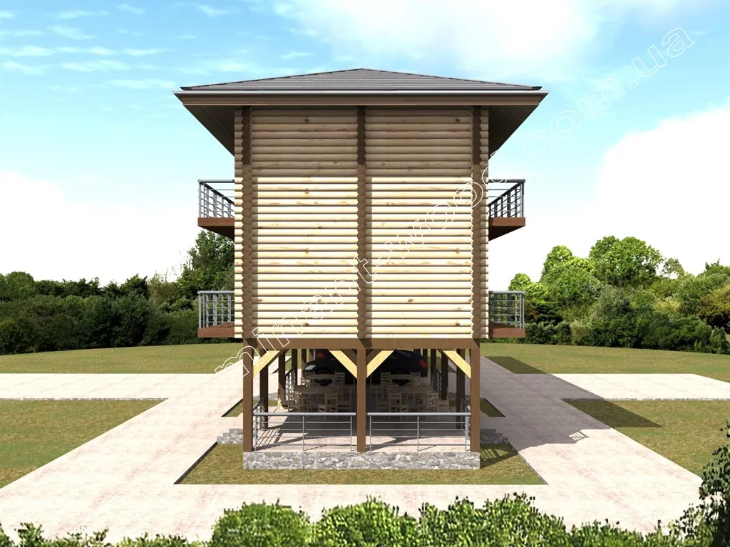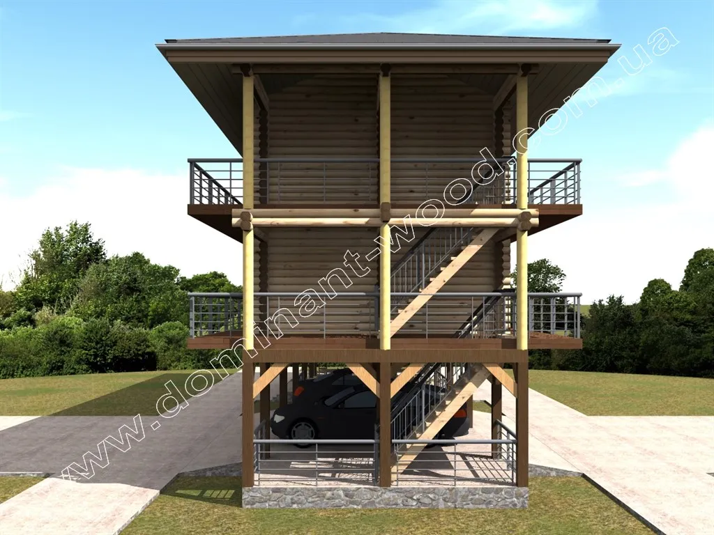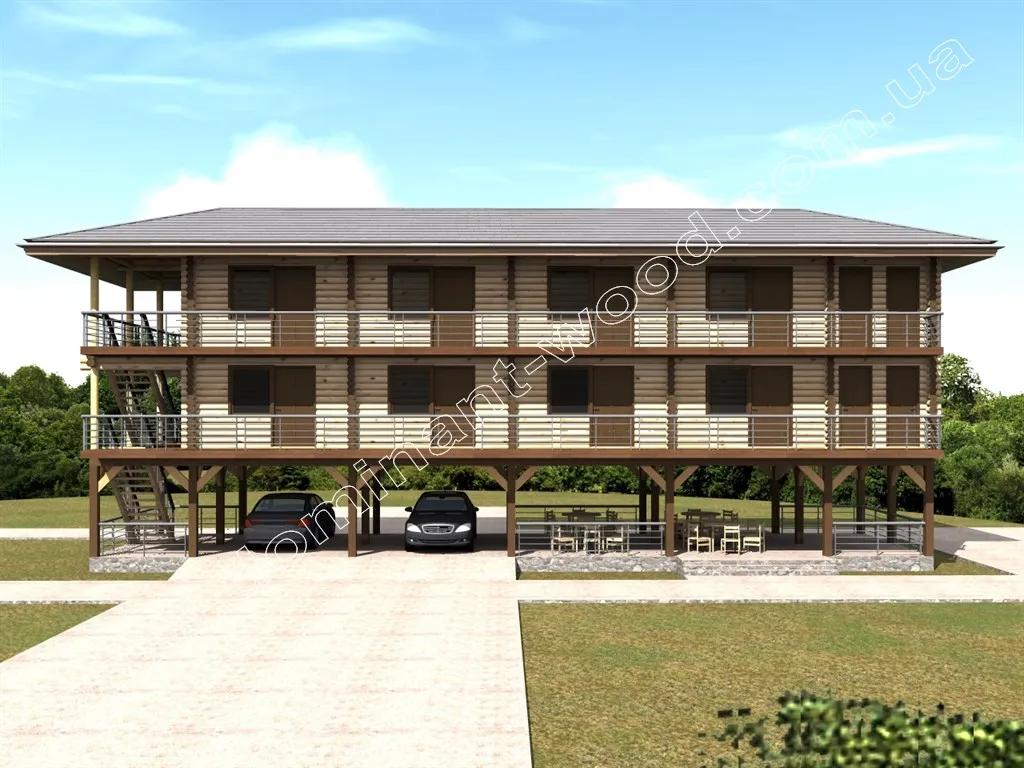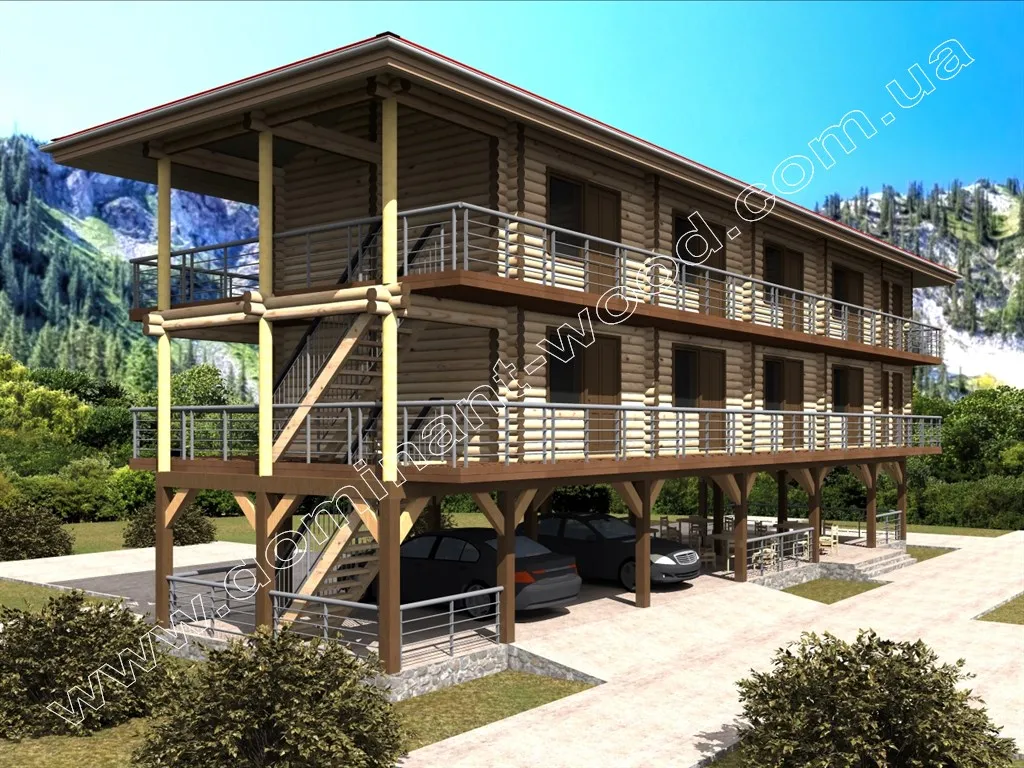 Ефектна будівля готелю з зрубу «Готелет» підноситься на потужних дерев’яних колонах, які дозволяють організувати тінисту парковку і терасу зі столиками для гостей відразу під будовою. Такий цікавий готель з бруса з безліччю балкончиков і терас стане справжньою оазою для міських жителів. Городяни під час відпустки завжди прагнуть відпочинку на природі подалі від міського смогу. Оригінальний дизайн дерев’яної будови приверне багато гостей і стане запорукою високого прибутку.