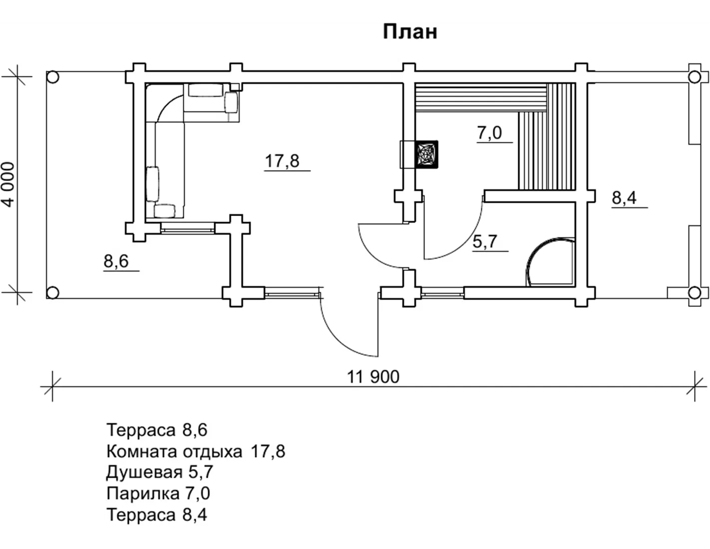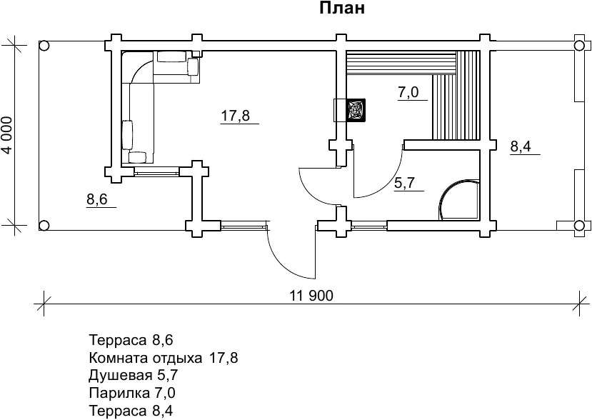 Що знаменно, так це розташування терас з боків від основної частини лазні з входом, що було б логічно з точки зору класичної планування. Завдяки цьому дизайнерському ходу, у вас є дві зони відпочинку, які можуть бути по-різному цільовими. В одній можна встановити мангал і стіл для гостей, а в іншій - залишити, наприклад, велосипеди або речі, яким шкідливий дощ і негода. Це розділить господарську зону і зону відпочинку, зробить територію для шашликів більш акуратною і приємною для можливих фото. Само по собі банне приміщення невелике і просте. Місткість його до 5 чоловік.