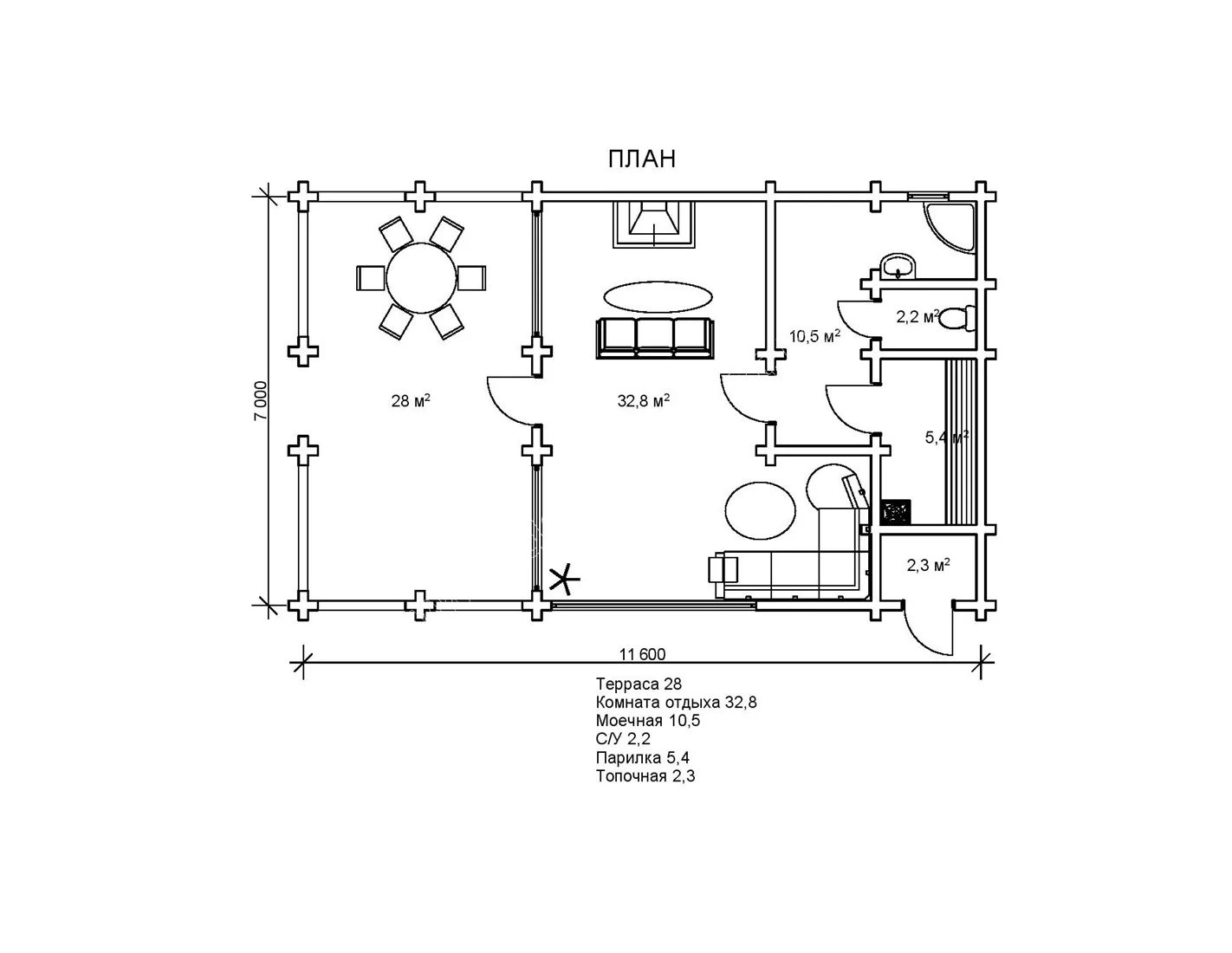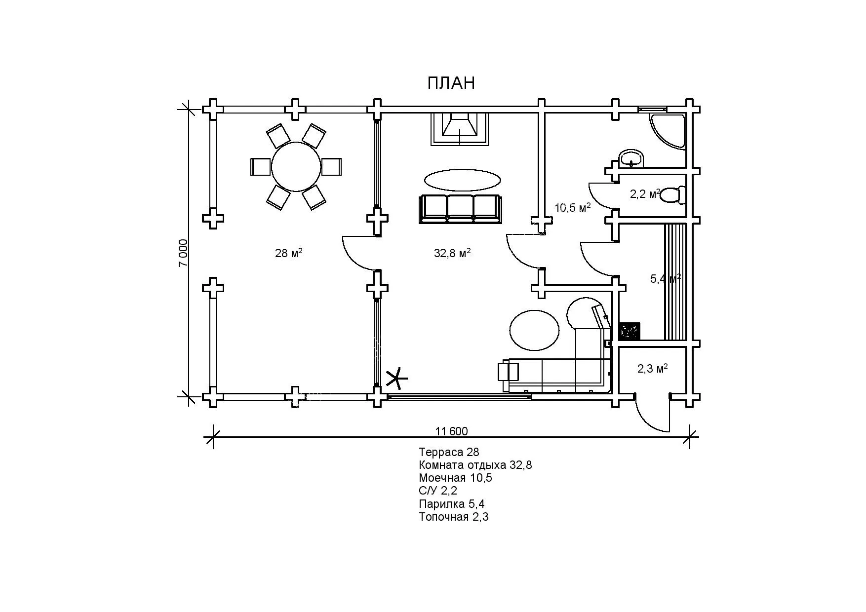 Розміри споруди досить нестандартні й становлять 7 на 11,6 м. Це пояснюється особливостями внутрішнього планування проекту Ніагара dominant-wood.com.ua/uk/proekty/884-niagara. Баня включає відкриту простору терасу, кімнату відпочинку, душову, парилку, санвузол, топкову. Простора літня тераса площею 28 м² подовжує будову, додаючи їй простору. На такій місткій терасі можна влаштувати і літню їдальню, поставивши стіл зі стільцями, і облаштувати лаунж-зону на свіжому повітрі, поставивши комфортний м’який куточок або шезлонги. Дерев’яна лазня з бруса Ніагара - сучасний, багатофункціональний проект, який можна реалізувати в якості літньої дачі, лазні для відпочинку сім’ї та друзів або для комерційного використання. Адже в лазні створені комфортні умови не тільки для парних процедур. У просторій вітальні площею 32,8 м² можна встановити плиту і помістити кухонне приладдя. Тоді в будиночку можна буде приготувати поїсти і переночувати. Переваги оциліндрованої баньки Ніагара по достоїнству оцінять всі любителі дачного і банного відпочинку.