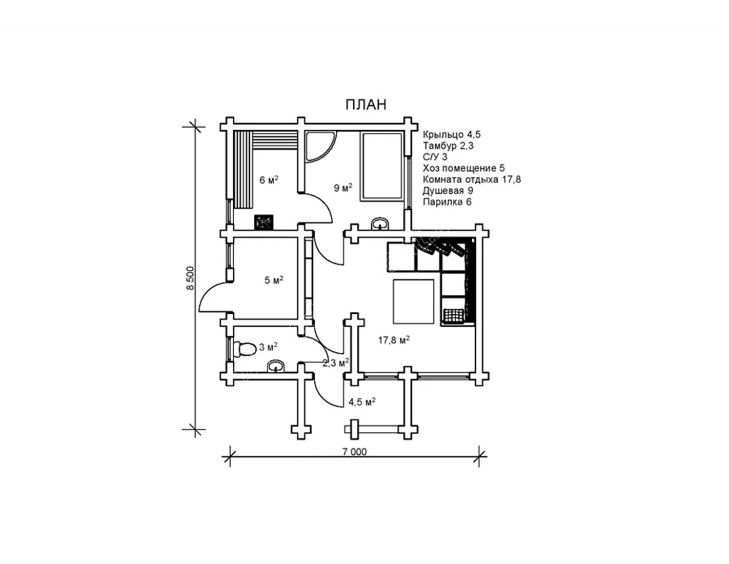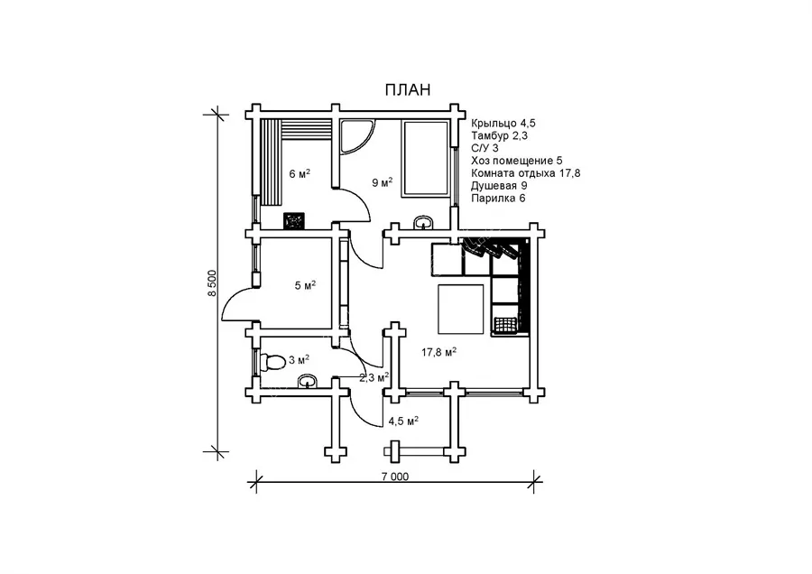 Лазня з оциліндрованого брусу 7 м на 8,5 м - «Німфа»