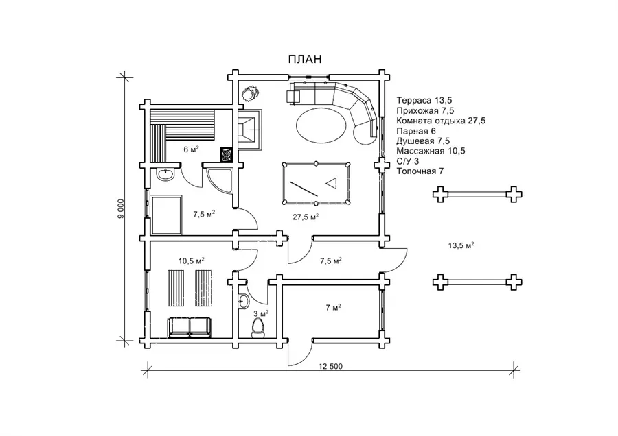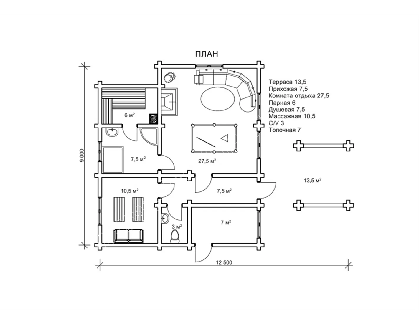 У проекті лазні Рута крім основних приміщень, які повинні бути присутніми в кожній лазні, додатково продумано наявність масажною кімнати і більярдної. Банні процедури заслужено вважаються дуже корисними для оздоровлення організму. Вони покращують кровообіг і нормалізують обмін речовин.