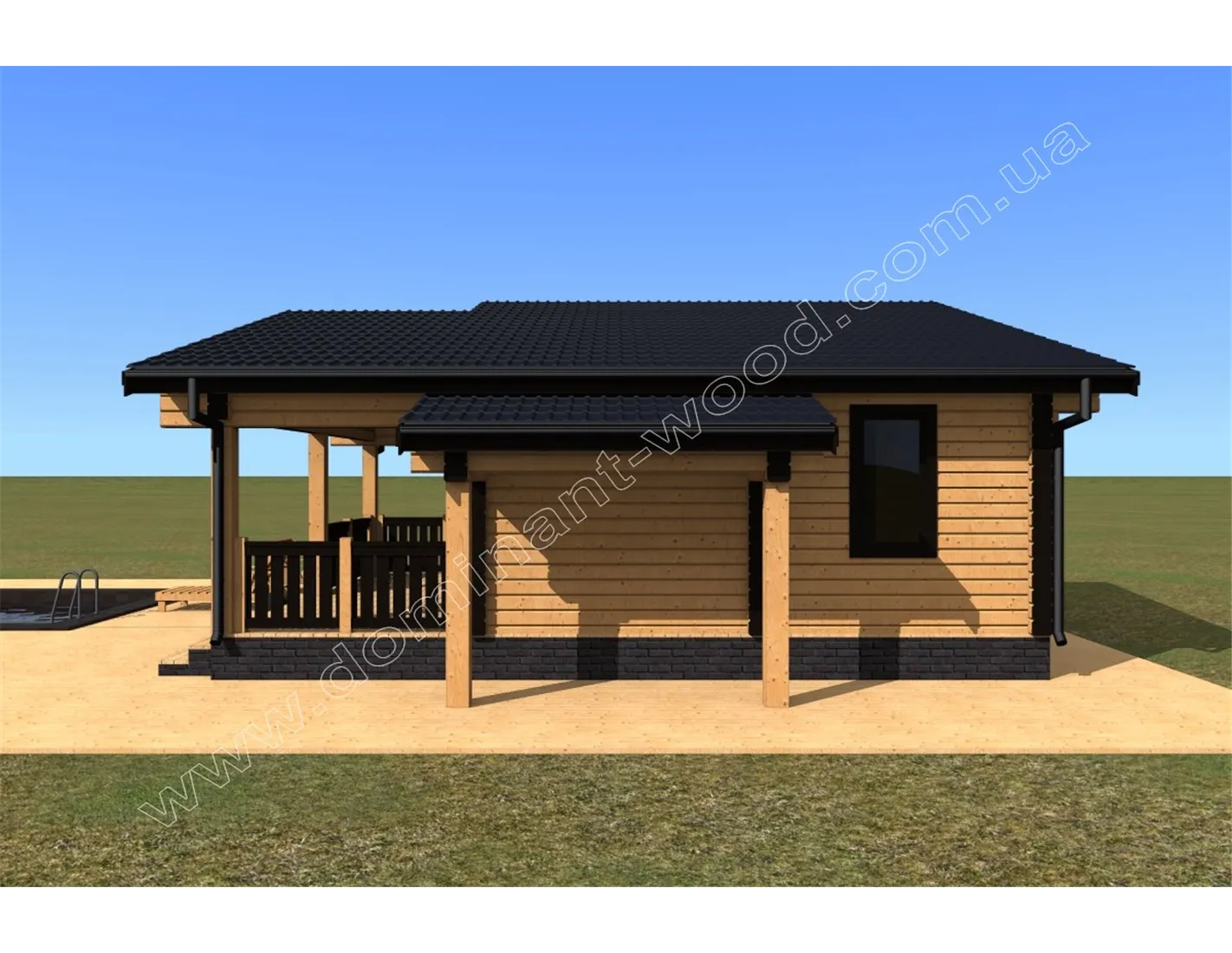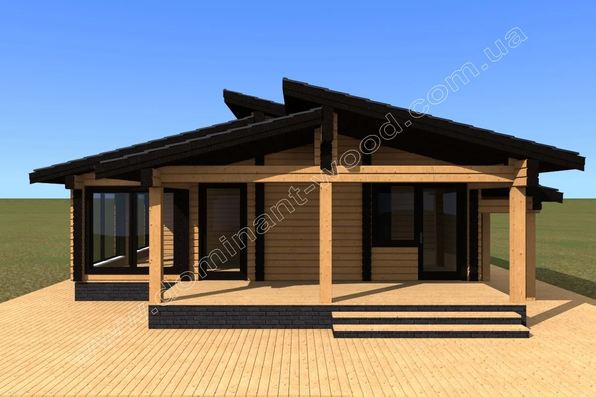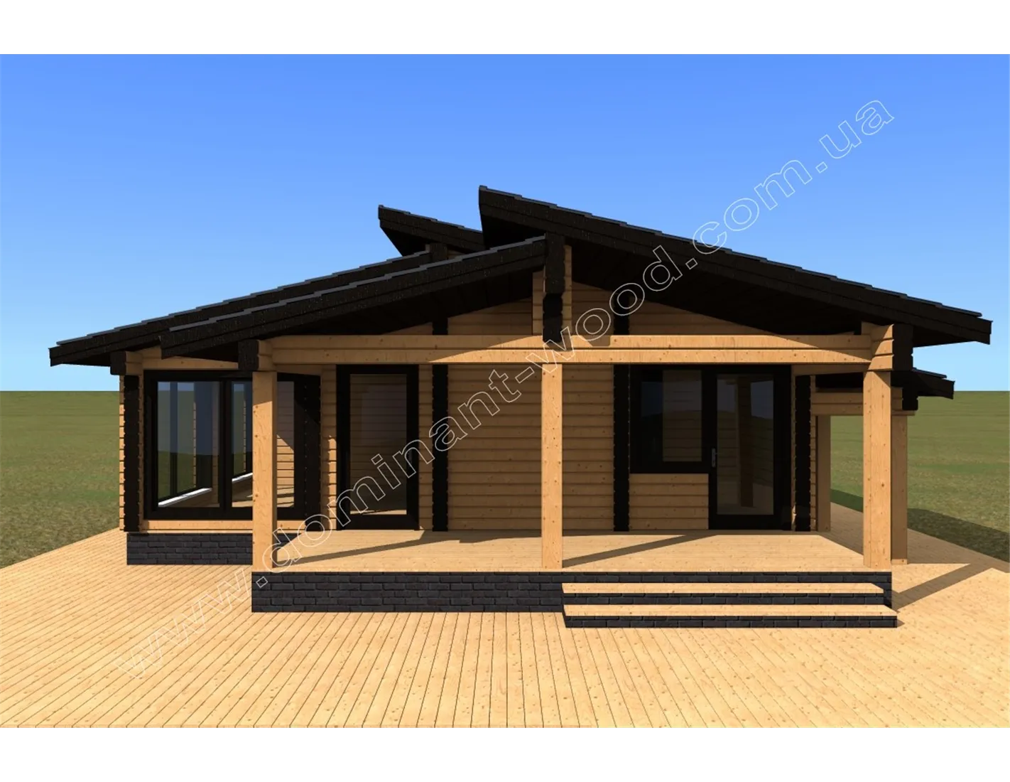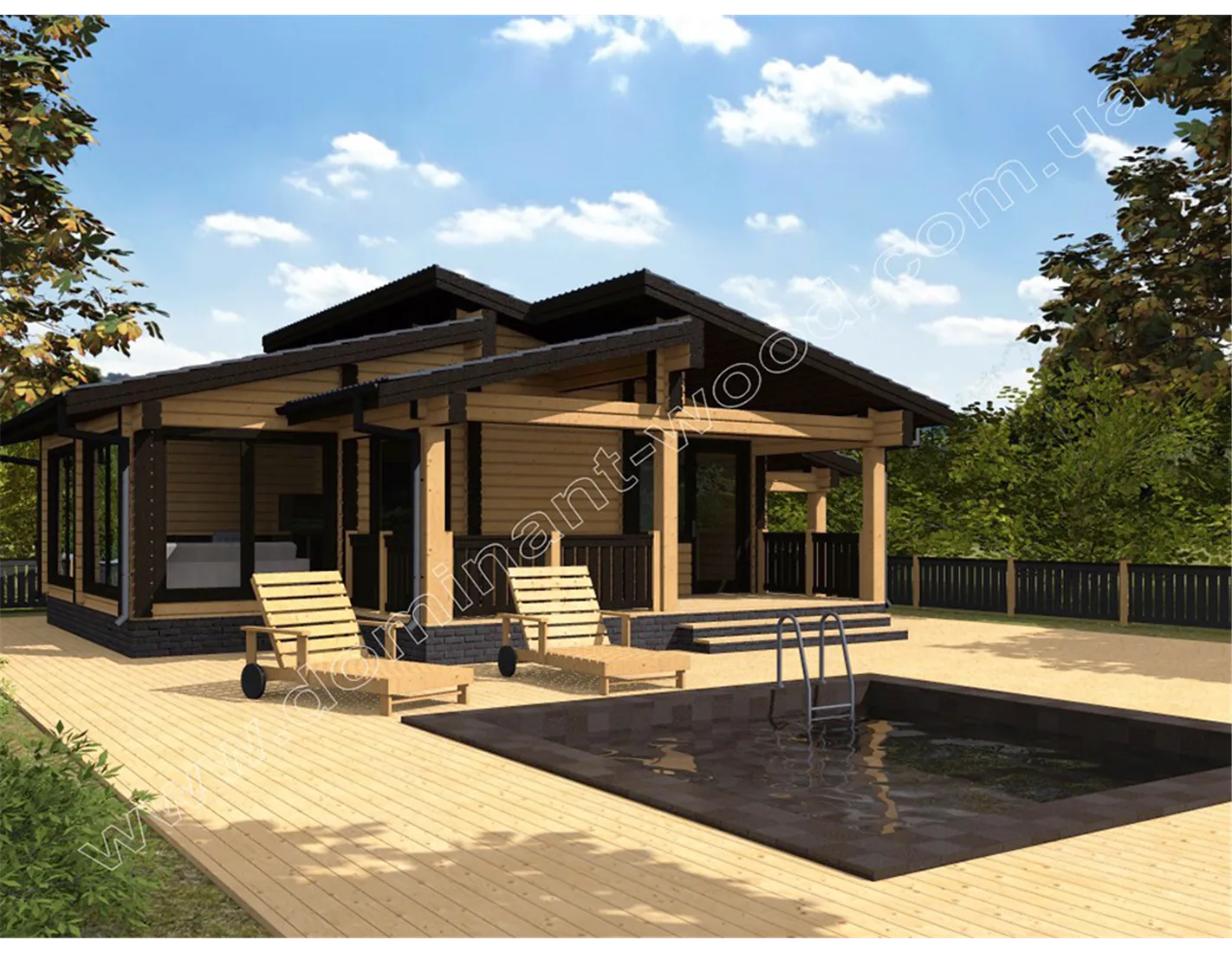Стильна і модна лазня з цільного сухого профільованого бруса Тандіс мало чим нагадує дерев’яну хатинку, з якою асоціюється класична дерев’яна лазня. Це швидше сучасне бунгало в стилі хай-тек з величезними вікнами, розкішною літньою терасою, парною і просторою кімнатою відпочинку.
