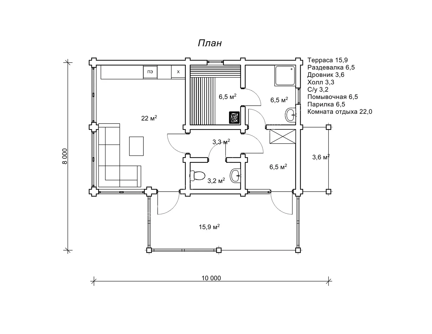 Проект також традиційно передбачає наявність дровніка. А літня тераса додасть банному відпочинку родзинку у вигляді можливості вийти на вулицю і подихати свіжим повітрям прямо під час банних процедур.