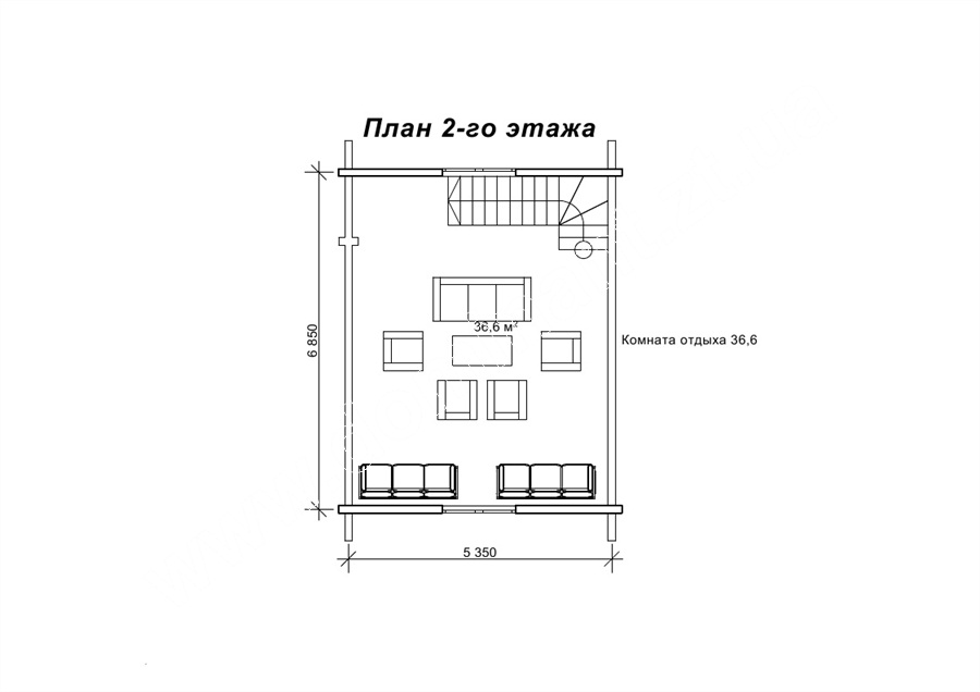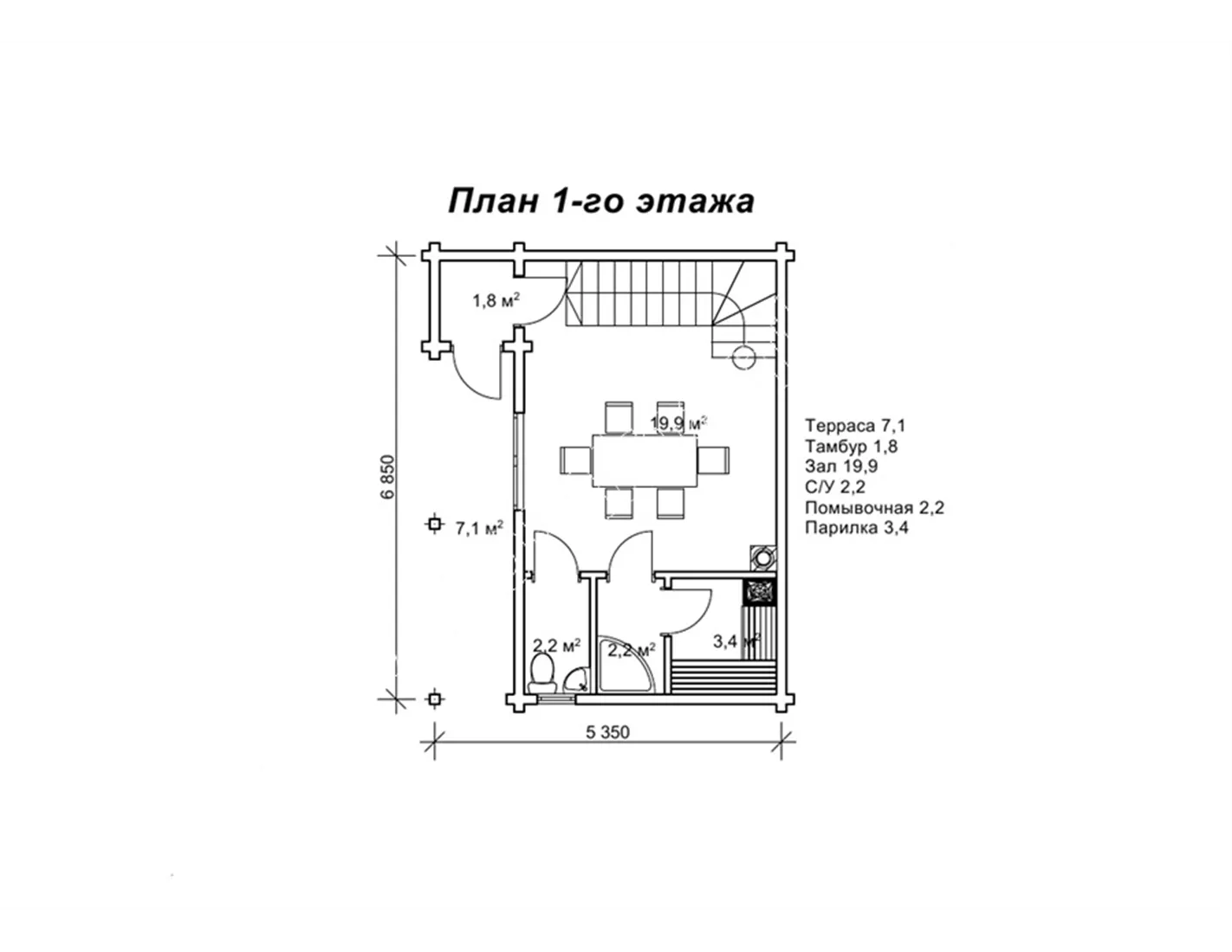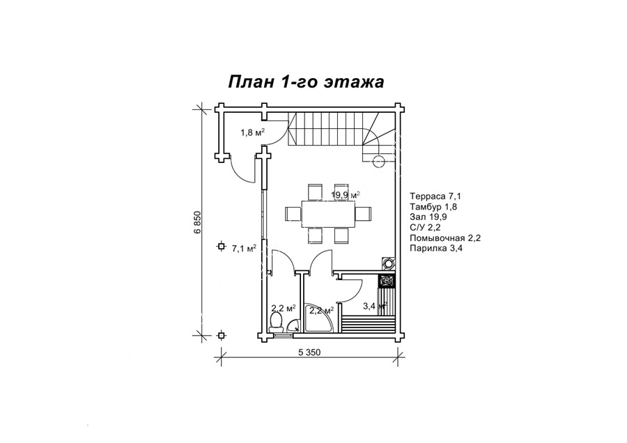 Прекрасна тераса, хоч і не велика, але радує своєю присутністю. Нехай вас не бентежить візуально компактний розмір лазні, адже вона дуже навіть велика і містка. Своїм плануванням вона враховує всі зони комфорту. Нехай в цій лазні і спроектована невелика парилка, але зате зал дуже місткий, а наявність другого поверху розширює функціональність лазні і дає можливість використовувати її як дачний котедж. Другий поверх обладнаний під кімнату відпочинку. Тут можна поставити більярдний стіл або настільний футбол. Така лазня, природно, буде гармонійно виглядати в комплексі з іншими виробами з профільованого брусу. Її дуже зручно використовувати для великих компаній. Вона може виступати в якості приватного місця, а може бути комерційним проектом. У будь-якому випадку, лазня - це джерело вашого здоров’я і краси.