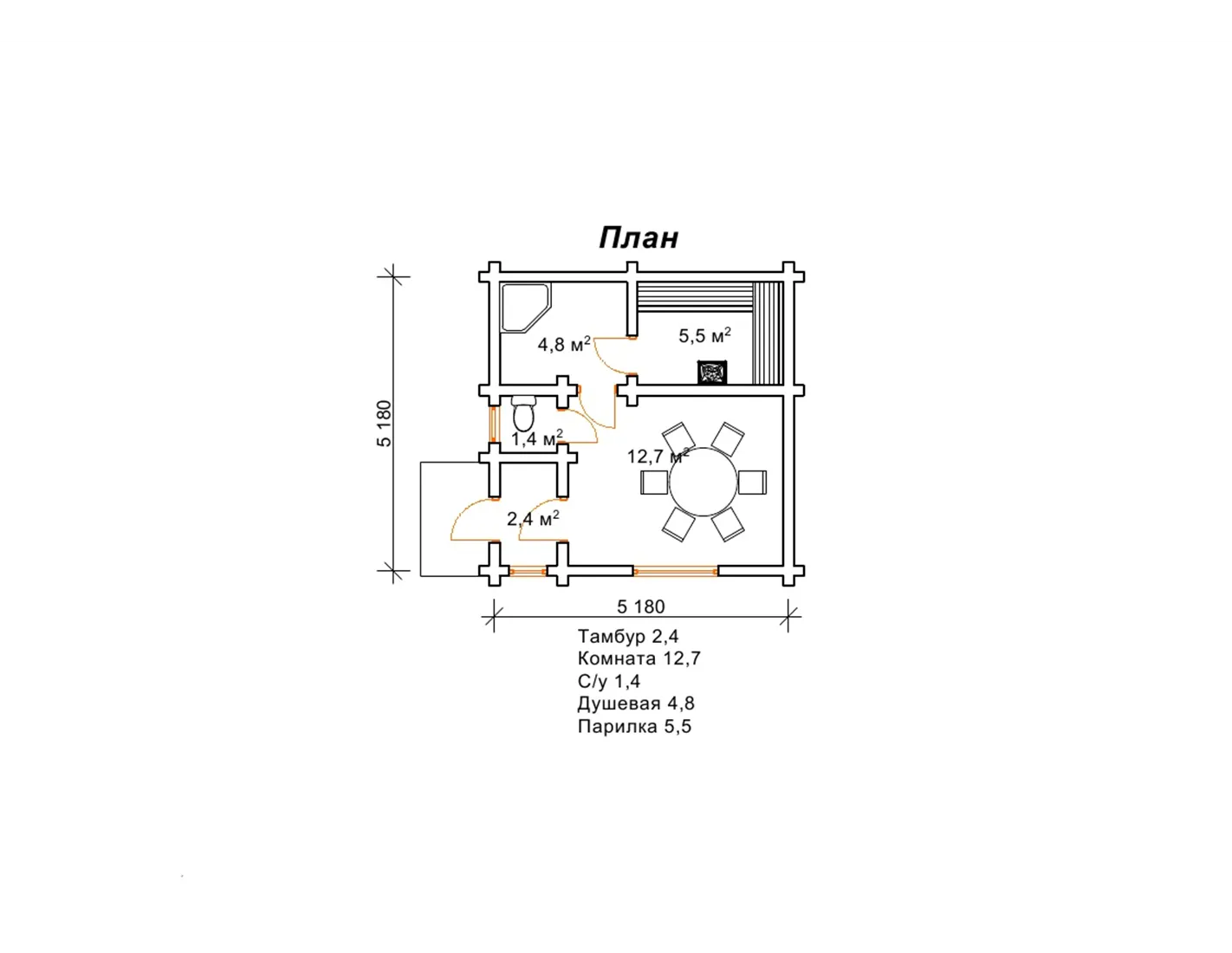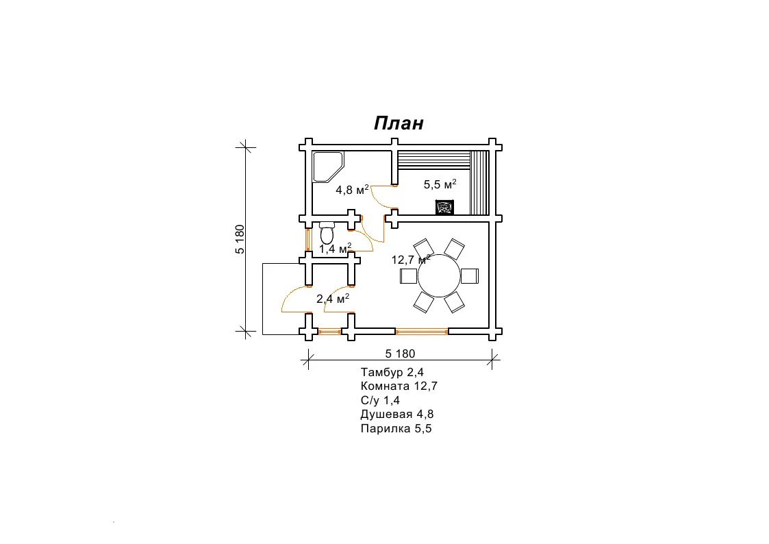 Проект маленької лазні Зорька призначений для невеликої ділянки. Проте, проект лазні передбачає всі необхідні приміщення: кімната, душова, парилка, санвузол. Нічого зайвого. Все тільки для оздоровчих банних процедур. Форма лазні класична, практично квадратна, без додаткових геометричних граней і рівнів даху. Простий дизайн приміщення, включає в себе все необхідне для банного процесу.