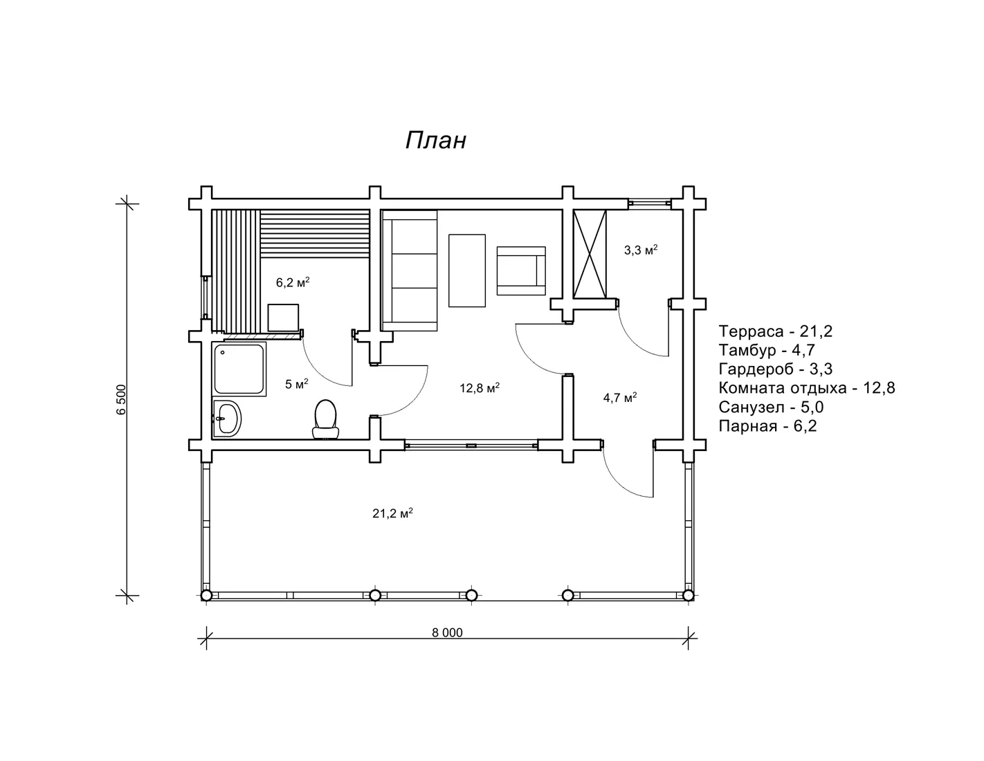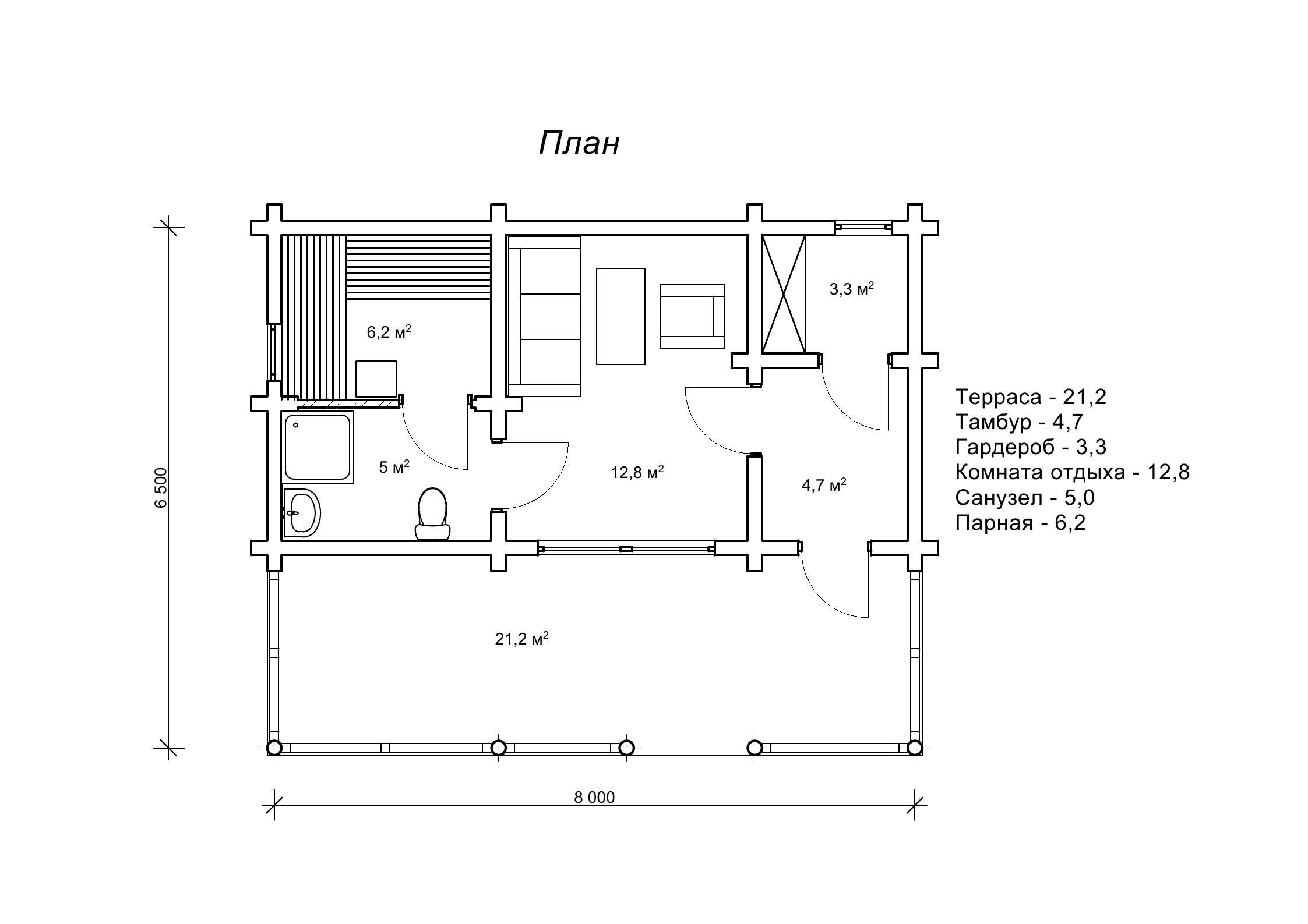 Планування лазні «Габор» зі зрубу 6,5 на 8 м