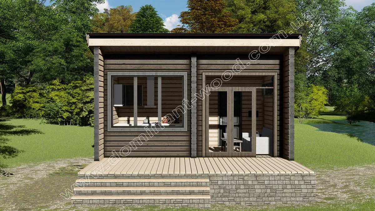 Сучасна і дуже стильна лазня «Елінора» під односхилим дахом зовсім не схожа на звичні зруби оциліндрованих лазень. Лаконічна, акуратна будова швидше нагадує офіс або магазин. Гладко відшліфовані стіни і сувора геометрія будівлі формує скандинавський мінімалізм екстер’єру. Це сучасне бунгало з великими вікнами стане вигідним придбанням для приватного використання або ефектним доповненням готельного комплексу.
