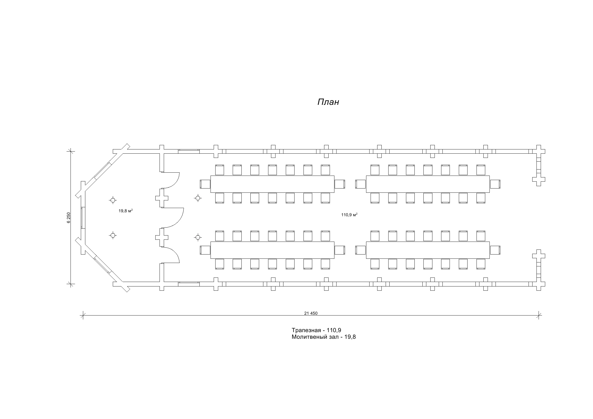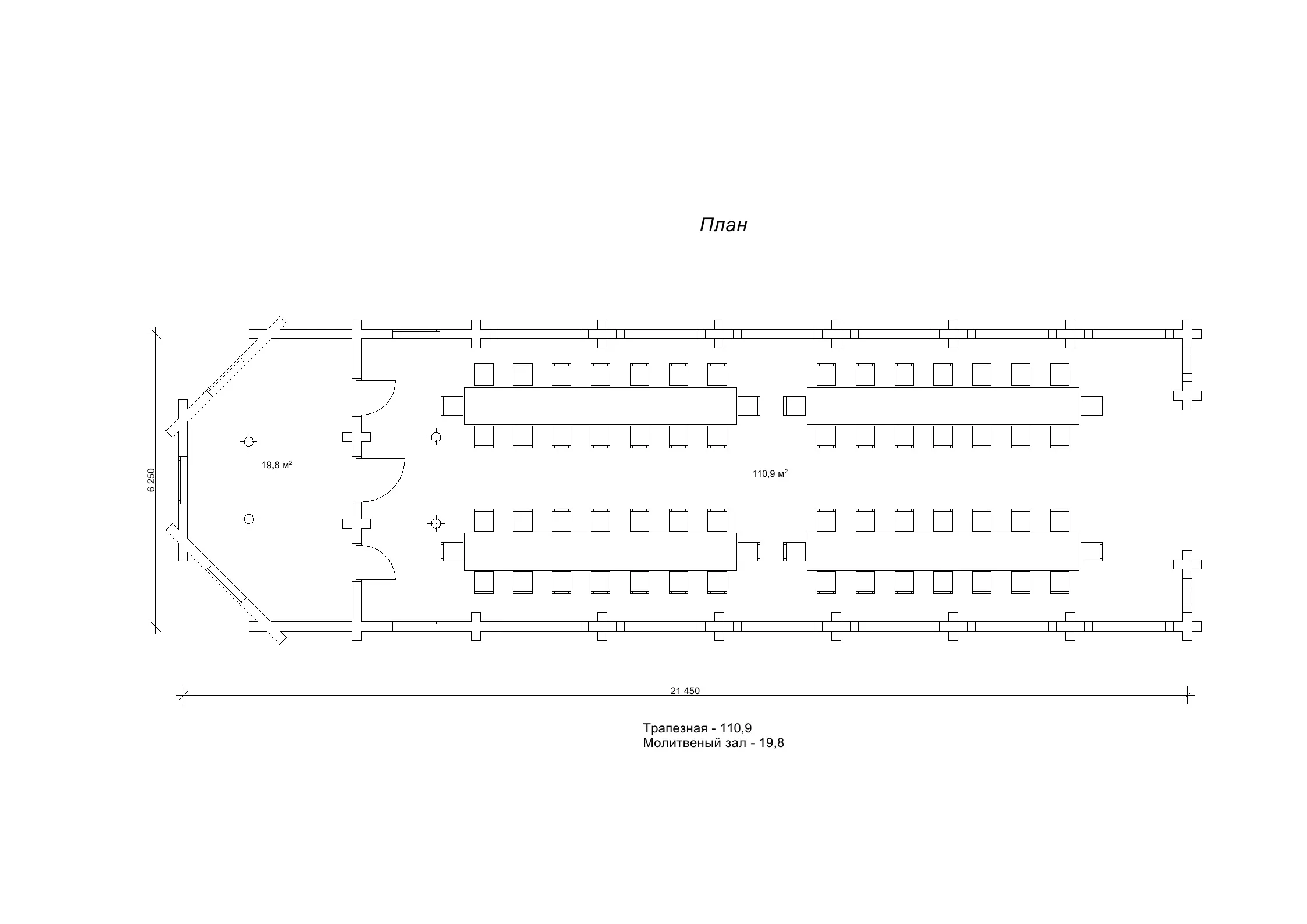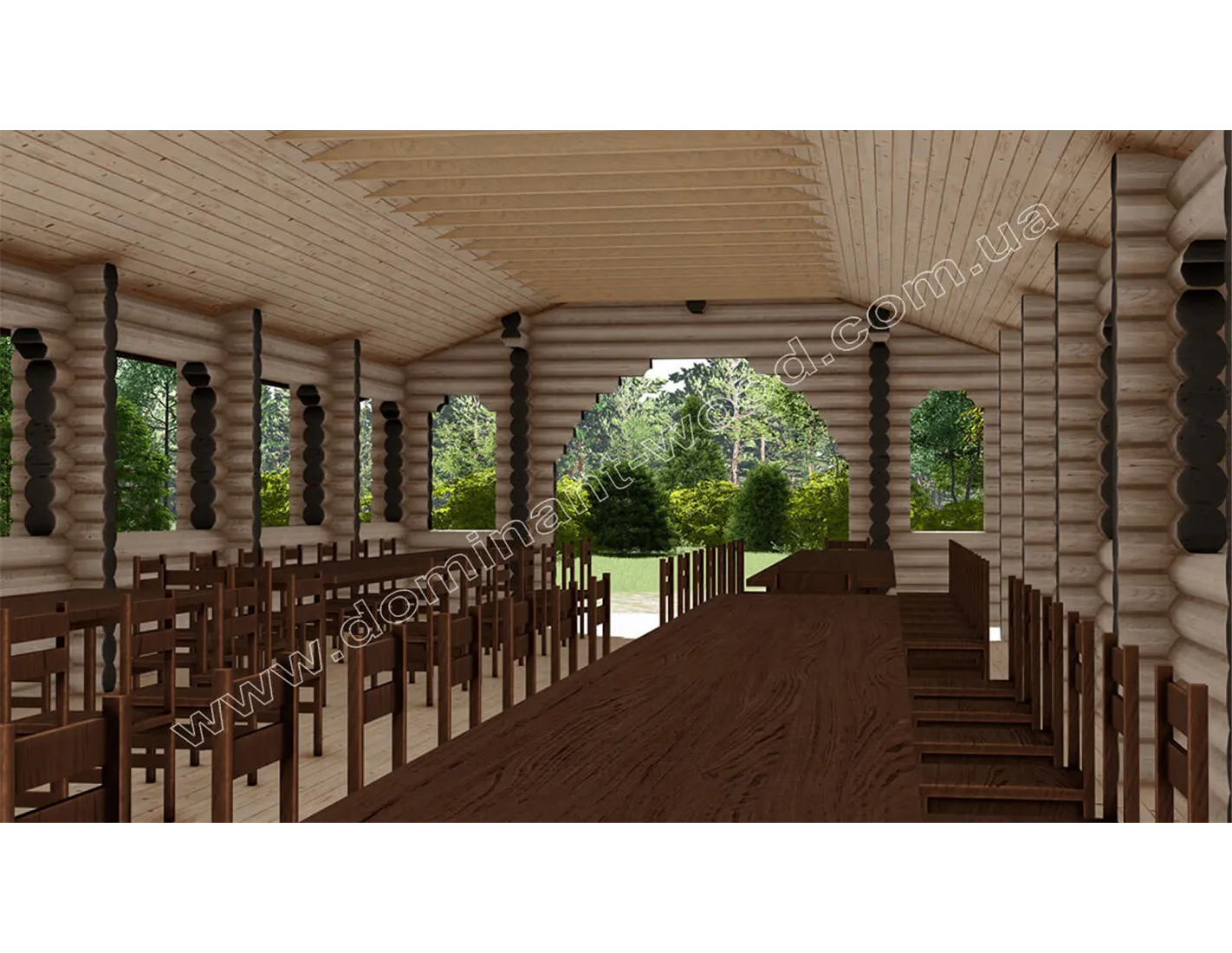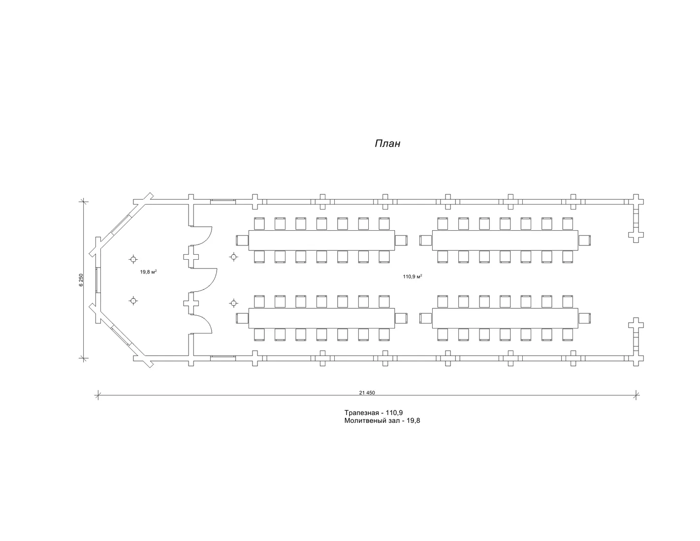 Планування «Свято-Духовської Трапезної» розташовується в параметрах 21,4 на 6,2 м і займає досить велику площу 130,7 м2. Щоб побудувати таку споруду в монастирському комплексі варто подбати про наявність достатньої території під забудову. Павільйон дерев’яної трапезної складається з двох частин - відкритої і закритої. Відкрита конструкція володіє площею 110,9 м2. Тут розташовані великі обідні столи. Специфічною особливістю проектів трапезних вважається таке планування, щоб у всіх була можливість приймати їжу за одним столом. Тому в «Свято-Духовській Трапезній» максимально враховуються загальноприйняті церковні канони. Закритий зал розрахований на розмір 19,8 м2 і може бути використаний для молитов чи для господарських потреб церковнослужителів. Для обговорення деталей оформлення замовлення на сосновий зруб «Свято-Духовської Трапезної», звертайтеся за номерами «Домінант», зазначеним у верхній частині сторінки.