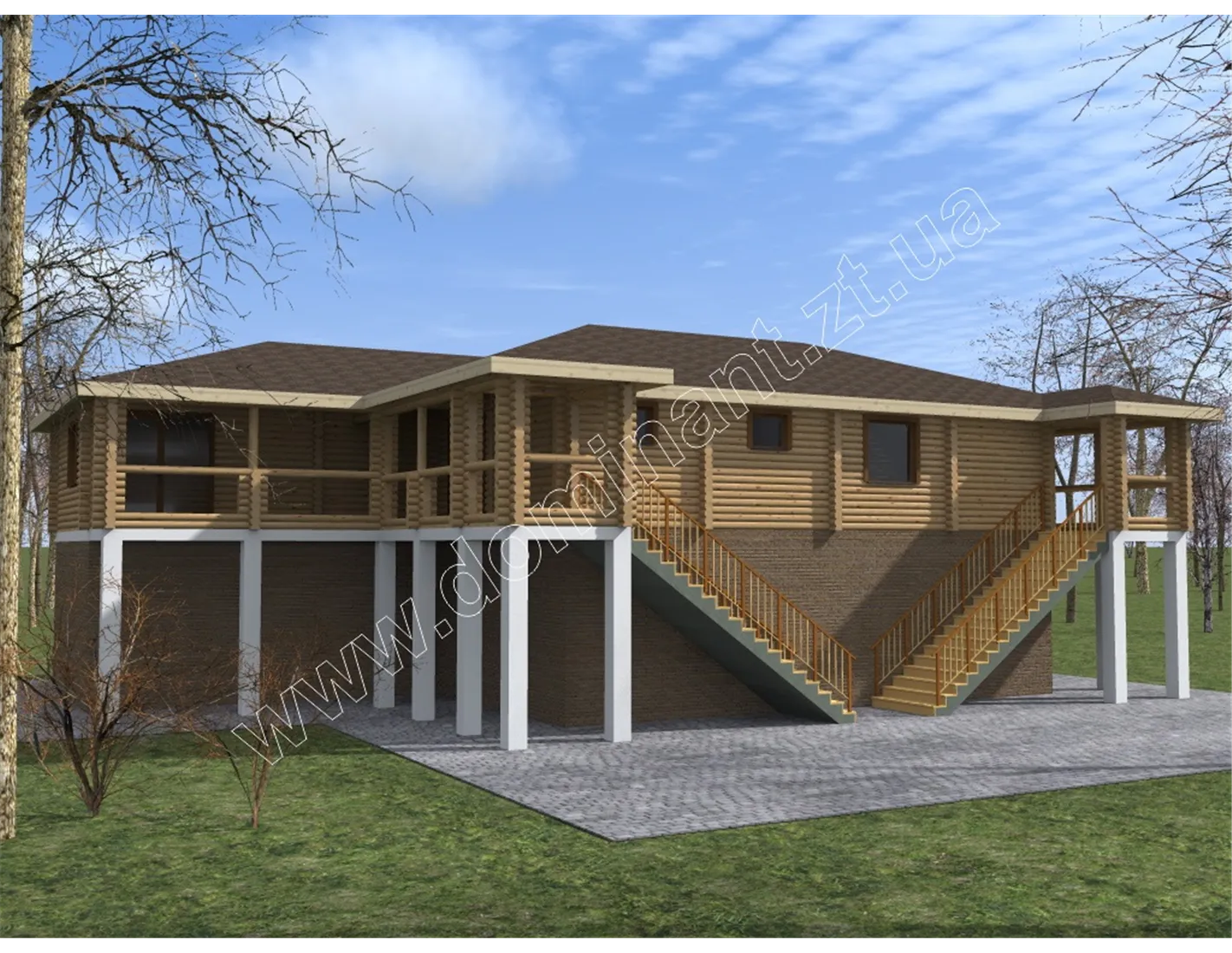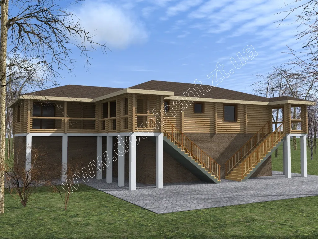 Проект «Аксінья» вельми незвичайний. Виглядає дуже презентабельно і не стандартно. Компанія «Домінант» dominant-wood.com.ua/ здійснювала дерев’яну частину будівлі, яка ідеально доповнила і завершила всю будівлю. Масштаби і оригінальність конструкції звертають нашу увагу, в першу чергу, на сходовий хід, що зводиться до центру фасаду. Сполучення каменю і дерева з вибіленими опорами перетворюють будинок в своєрідний геометричний об’єкт. Тут очікується гра форм не тільки зовні, але і всередині. Поділ на зони, завдяки різній якості матеріалів виконання, вигідно впливає на будівництво, особливо в місцях з підвищеною вологістю.